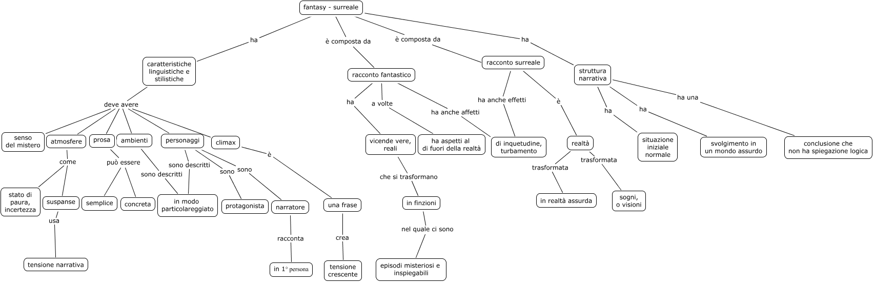 Questa Cmap, creata con IHMC CmapTools, contiene informazioni relative a: fantasy - surreale, atmosfere come suspanse, suspanse usa tensione narrativa, caratteristiche linguistiche e stilistiche deve avere senso del mistero, struttura narrativa ha svolgimento in un mondo assurdo, racconto fantastico ha anche affetti di inquetudine, turbamento, in finzioni nel quale ci sono episodi misteriosi e inspiegabili, racconto surreale ha anche effetti di inquetudine, turbamento, caratteristiche linguistiche e stilistiche deve avere atmosfere, caratteristiche linguistiche e stilistiche deve avere personaggi, vicende vere, reali che si trasformano in finzioni, caratteristiche linguistiche e stilistiche deve avere climax, fantasy - surreale ha struttura narrativa, atmosfere come stato di paura, incertezza, fantasy - surreale è composta da racconto surreale, personaggi sono narratore, racconto surreale è realtà, realtà trasformata in realtà assurda, personaggi sono descritti in modo particolareggiato, personaggi sono protagonista, caratteristiche linguistiche e stilistiche deve avere ambienti