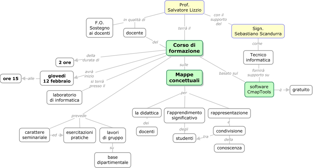 Questa Cmap, creata con IHMC CmapTools, contiene informazioni relative a: Corso mappe concettuali, Sign. Sebastiano Scandurra come Tecnico informatica, Mappe concettuali per l'apprendimento significativo, docente del Corso di formazione, Prof. Salvatore Lizzio con il supporto del Sign. Sebastiano Scandurra, condivisione della conoscenza, Corso di formazione prevede esercitazioni pratiche, Prof. Salvatore Lizzio in qualità di F.O. Sostegno ai docenti, Prof. Salvatore Lizzio in qualità di docente, Corso di formazione prevede lavori di gruppo, Prof. Salvatore Lizzio terrà il Corso di formazione, Mappe concettuali per rappresentazione, Tecnico informatica fornirà supporto su software CmapTools, condivisione tra studenti, Corso di formazione si terrà presso il laboratorio di informatica, carattere seminariale ed esercitazioni pratiche, l'apprendimento significativo degli studenti, Corso di formazione avrà inizio giovedì 12 febbraio, Mappe concettuali per la didattica, Corso di formazione sulle Mappe concettuali, giovedì 12 febbraio alle ore 15