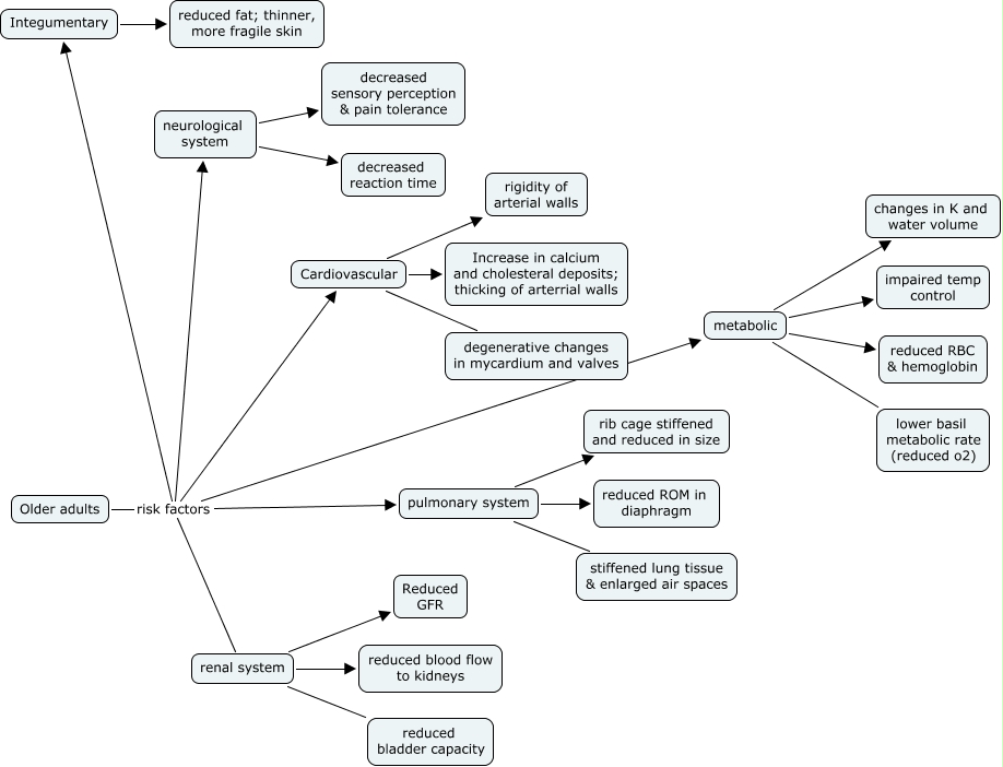 This Concept Map, created with IHMC CmapTools, has information related to: surgery risks for geriatrics, Cardiovascular Increase in calcium and cholesteral deposits; thicking of arterrial walls, Older adults risk factors metabolic, Older adults risk factors renal system, metabolic changes in K and water volume, Integumentary reduced fat; thinner, more fragile skin, pulmonary system stiffened lung tissue & enlarged air spaces, Older adults risk factors pulmonary system, pulmonary system reduced ROM in diaphragm, Older adults risk factors Integumentary, Older adults risk factors neurological system, renal system reduced bladder capacity, Older adults risk factors Cardiovascular, pulmonary system rib cage stiffened and reduced in size, metabolic lower basil metabolic rate (reduced o2), metabolic reduced RBC & hemoglobin, renal system Reduced GFR, Cardiovascular degenerative changes in mycardium and valves, renal system reduced blood flow to kidneys, neurological system decreased sensory perception & pain tolerance, neurological system decreased reaction time