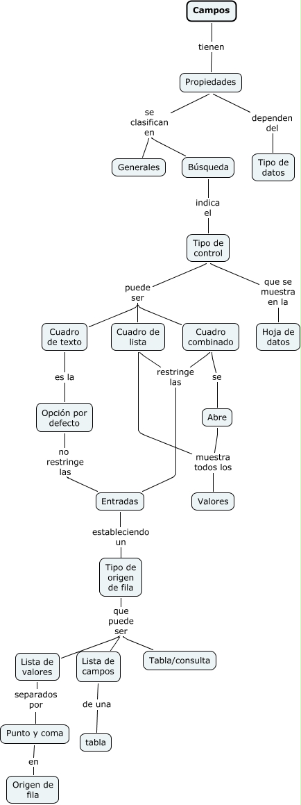 Este Cmap, tiene información relacionada con: Propiedades del campo, Entradas estableciendo un Tipo de origen de fila, Tipo de control que se muestra en la Hoja de datos, Cuadro combinado se Abre, Opción por defecto no restringe las Entradas, Tipo de control puede ser Cuadro combinado, Tipo de control puede ser Cuadro de texto, Tipo de origen de fila que puede ser Tabla/consulta, Propiedades dependen del Tipo de datos, Cuadro de texto es la Opción por defecto, Búsqueda indica el Tipo de control, Tipo de origen de fila que puede ser Lista de valores, Propiedades se clasifican en Búsqueda, Cuadro de lista restringe las Entradas, Punto y coma en Origen de fila, Lista de valores separados por Punto y coma, Cuadro combinado restringe las Entradas, Cuadro de lista muestra todos los Valores, Campos tienen Propiedades, Tipo de control puede ser Cuadro de lista, Lista de campos de una tabla