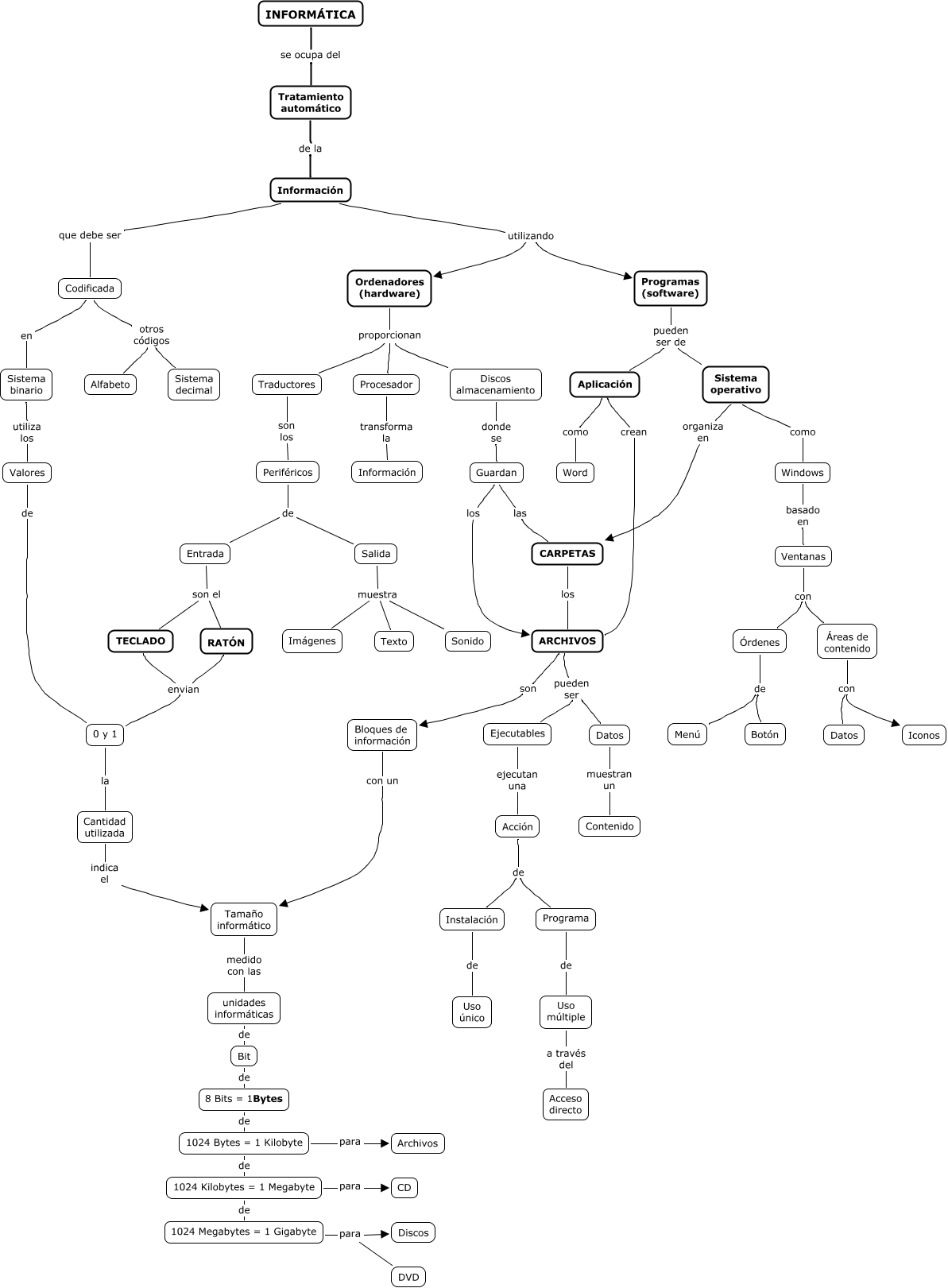 Este Cmap, tiene información relacionada con: Informática, Tratamiento automático de la Información, Periféricos de Entrada, Datos muestran un Contenido, 1024 Megabytes = 1 Gigabyte para DVD, Sistema operativo organiza en CARPETAS, Procesador transforma la Información, Codificada otros códigos Sistema decimal, Sistema binario utiliza los Valores, Periféricos de Salida, Valores de 0 y 1, Órdenes de Botón, Áreas de contenido con Datos, unidades informáticas de Bit, Acción de Instalación, Cantidad utilizada indica el Tamaño informático, Programas (software) pueden ser de Aplicación, INFORMÁTICA se ocupa del Tratamiento automático, 1024 Megabytes = 1 Gigabyte para Discos, Entrada son el RATÓN, Ventanas con Áreas de contenido