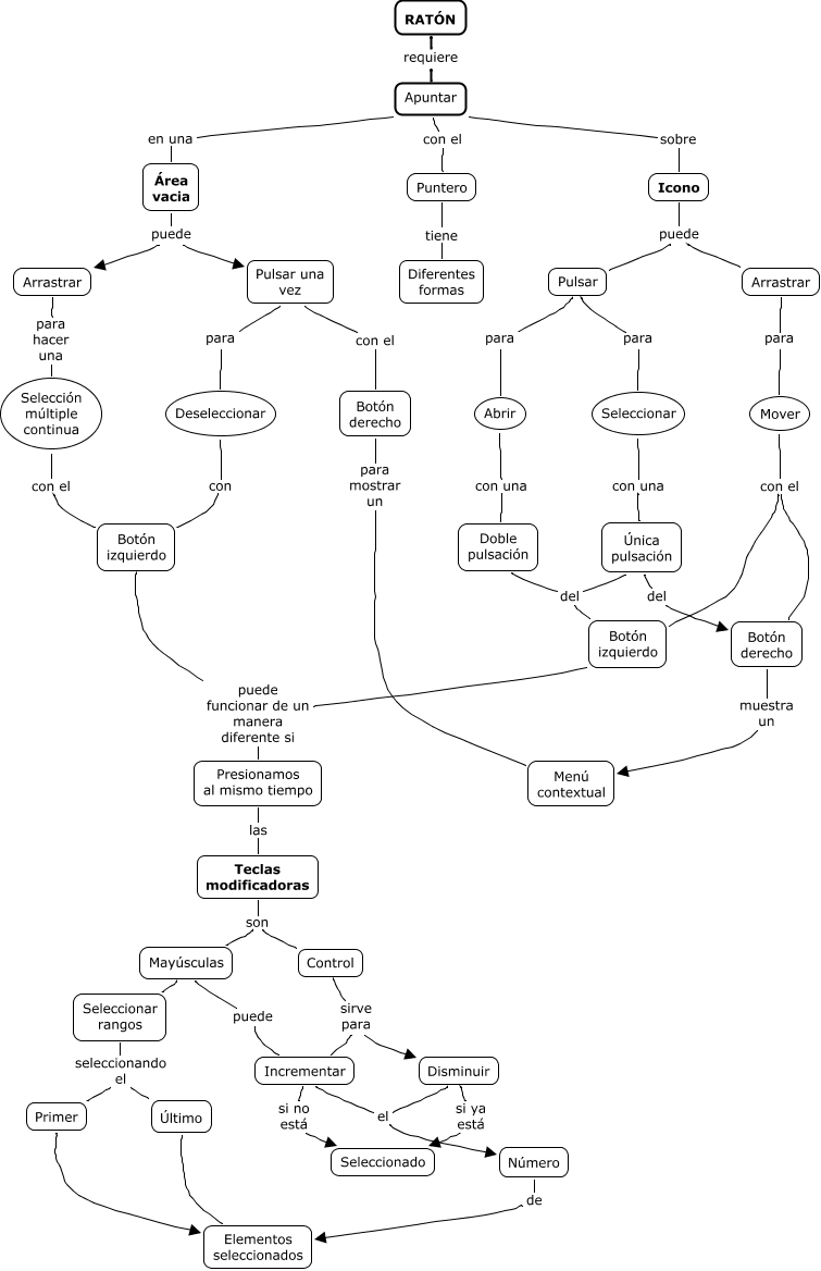 Este Cmap, tiene información relacionada con: Ratón, Arrastrar para hacer una Selección múltiple continua, Puntero tiene Diferentes formas, Mayúsculas Seleccionar rangos, Apuntar sobre Icono, Teclas modificadoras son Control, Control sirve para Disminuir, Seleccionar rangos seleccionando el Último, Presionamos al mismo tiempo las Teclas modificadoras, Incrementar el Número, Área vacia puede Arrastrar, Botón izquierdo puede funcionar de un manera diferente si Presionamos al mismo tiempo, Disminuir si ya está seleccionado, Mayúsculas puede Incrementar, Control sirve para Incrementar, Pulsar una vez con el Botón derecho, Botón izquierdo puede funcionar de un manera diferente si Presionamos al mismo tiempo, Área vacia puede Pulsar una vez, Primer Elementos seleccionados, Abrir con una Doble pulsación, Icono puede Arrastrar