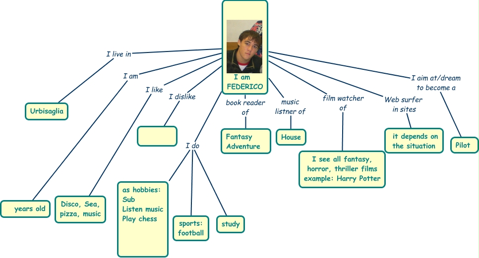 This Concept Map, created with IHMC CmapTools, has information related to: Octopus_AboutMe_Map_Fede_toma, I am FEDERICO I dislike, I am FEDERICO I do as hobbies: Sub Listen music Play chess, I am FEDERICO film watcher of I see all fantasy, horror, thriller films example: Harry Potter, I am FEDERICO I live in Urbisaglia, I am FEDERICO I am years old, I am FEDERICO Web surfer in sites it depends on the situation, I am FEDERICO I like Disco, Sea, pizza, music, I am FEDERICO I do sports: football, I am FEDERICO music listner of House, I am FEDERICO book reader of Fantasy Adventure, I am FEDERICO I do study, I am FEDERICO I aim at/dream to become a Pilot