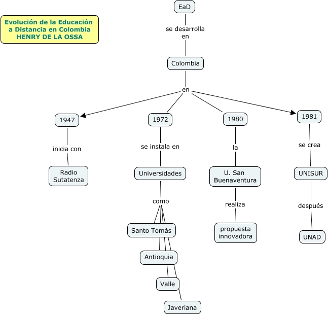 Este Cmap, tiene información relacionada con: EaD, Universidades como Santo Tomás, Colombia en 1980, 1980 la U. San Buenaventura, 1972 se instala en Universidades, 1981 se crea UNISUR, Universidades como Valle, UNISUR después UNAD, EaD se desarrolla en Colombia, 1947 inicia con Radio Sutatenza, Colombia en 1947, U. San Buenaventura realiza propuesta innovadora, Colombia en 1972, Colombia en 1981, Universidades como Javeriana, Universidades como Antioquia
