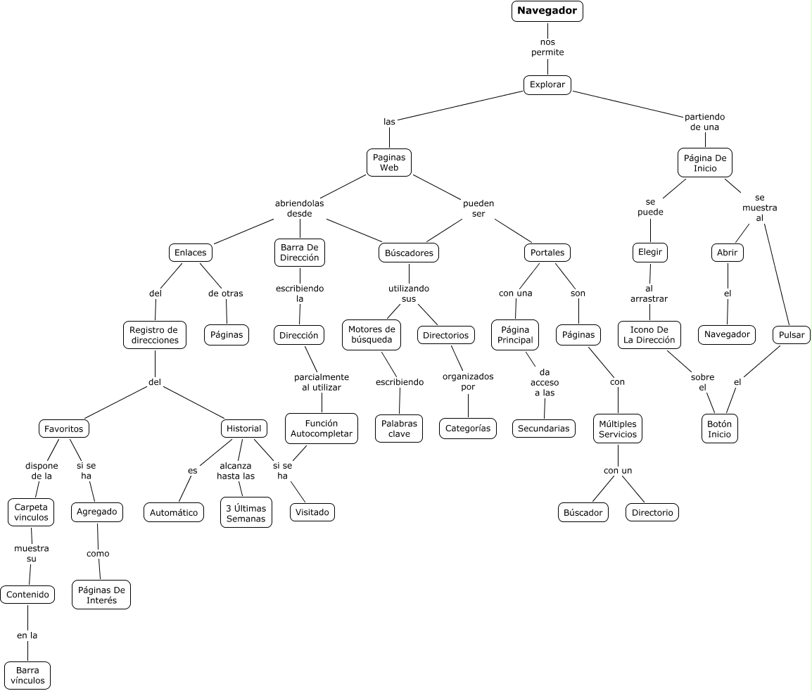 Este Cmap, tiene información relacionada con: Navegadores, Página De Inicio se muestra al Pulsar, Explorar partiendo de una Página De Inicio, Enlaces de otras Páginas, Registro de direcciones del Historial, Motores de búsqueda escribiendo Palabras clave, Paginas Web abriendolas desde Enlaces, Historial alcanza hasta las 3 Últimas Semanas, Página De Inicio se puede Elegir, Enlaces del Registro de direcciones, Favoritos si se ha Agregado, Favoritos dispone de la Carpeta vinculos, Paginas Web pueden ser Búscadores, Explorar las Paginas Web, Paginas Web abriendolas desde Barra De Dirección, Portales con una Página Principal, Carpeta vinculos muestra su Contenido, Directorios organizados por Categorías, Icono De La Dirección sobre el Botón Inicio, Elegir al arrastrar Icono De La Dirección, Registro de direcciones del Favoritos