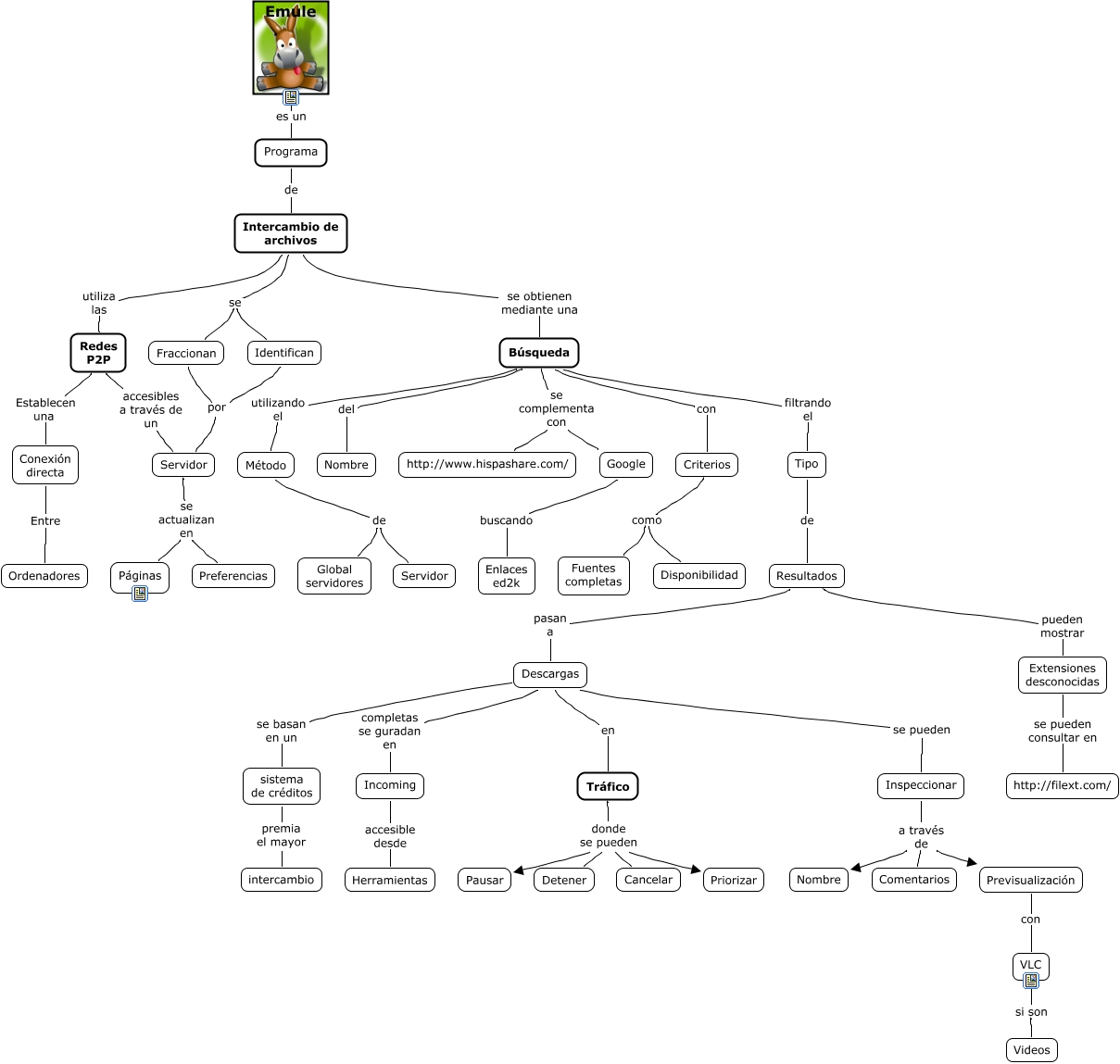 Este Cmap, tiene información relacionada con: Emule, Fraccionan por Servidor, Descargas se basan en un sistema de créditos, Descargas en Tráfico, Búsqueda se complementa con http://www.hispashare.com/, Resultados pueden mostrar Extensiones desconocidas, Intercambio de archivos se Identifican, Servidor se actualizan en Páginas, Descargas completas se guradan en Incoming, Inspeccionar a través de Previsualización, Emule es un Programa, Incoming accesible desde Herramientas, Tráfico donde se pueden Detener, Redes P2P accesibles a través de un Servidor, Tráfico donde se pueden Cancelar, Intercambio de archivos se obtienen mediante una Búsqueda, Tráfico donde se pueden Priorizar, Conexión directa Entre Ordenadores, Inspeccionar a través de Comentarios, Búsqueda filtrando el Tipo, Programa de Intercambio de archivos