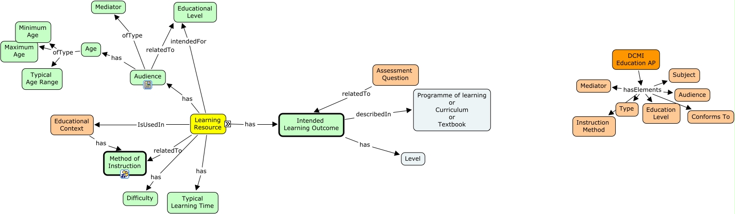 This Concept Map, created with IHMC CmapTools, has information related to: Part 5, DCMI Education AP hasElements Instruction Method, DCMI Education AP hasElements Conforms To, Work IsRealizedThrough Expression, Learning Resource has Typical Learning Time, DCMI Education AP hasElements Type, Intended Learning Outcome has Level, Learning Resource has Audience, DCMI Education AP hasElements Subject, Learning Resource has Intended Learning Outcome, Age ofType Maximum Age, Expression IsEmbodiedIn Manifestation, DCMI Education AP hasElements Education Level, Learning Resource IsUsedIn Educational Context, Learning Resource has Difficulty, Audience ofType Mediator, DCMI Education AP hasElements Audience, Age ofType Typical Age Range, Learning Resource relatedTo Method of Instruction, Audience relatedTo Educational Level, DCMI Education AP hasElements Mediator