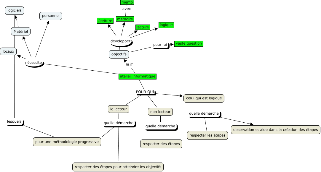 Cette carte de concepts créée avec IHMC CmapTools traite de: Sans titre 1, le lecteur quelle démarche respecter des étapes pour atteindre les objectifs, atelier informatique POUR QUI celui qui est logique, atelier informatique POUR QUI non lecteur, atelier informatique nécessite personnel, logiciels lesquels pour une méthodologie progressive, objectifs developper lecture, celui qui est logique quelle démarche respecter les étapes, atelier informatique nécessite locaux, atelier informatique nécessite Matériel, objectifs developper écriture, Matériel logiciels, celui qui est logique quelle démarche observation et aide dans la création des étapes, atelier informatique BUT objectifs, objectifs developper logique, objectifs pour lui vaste question, atelier informatique POUR QUI le lecteur, le lecteur quelle démarche pour une méthodologie progressive, non lecteur quelle démarche respecter des étapes, objectifs developper memoire, memoire avec memo