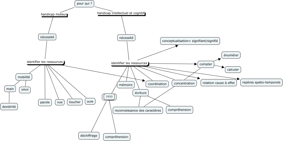 Cette carte de concepts créée avec IHMC CmapTools traite de: Sans titre 2, nécessité identifier les ressources mobilité, lecture ???? compréhension, écriture ???? compréhension, mobilité ???? yeux, nécessité identifier les ressources concentration, nécessité identifier les ressources écriture, compter ???? énumérer, nécessité identifier les ressources compter, nécessité identifier les ressources coordination, lecture ???? ????, main ???? dextérité, compter calculer, nécessité identifier les ressources repères spatio-temporels, nécessité identifier les ressources relation cause à effet, lecture ???? déchiffrage, mobilité ???? main, nécessité identifier les ressources toucher, nécessité identifier les ressources parole, nécessité identifier les ressources coordination, écriture ???? reconnaissance des caractères