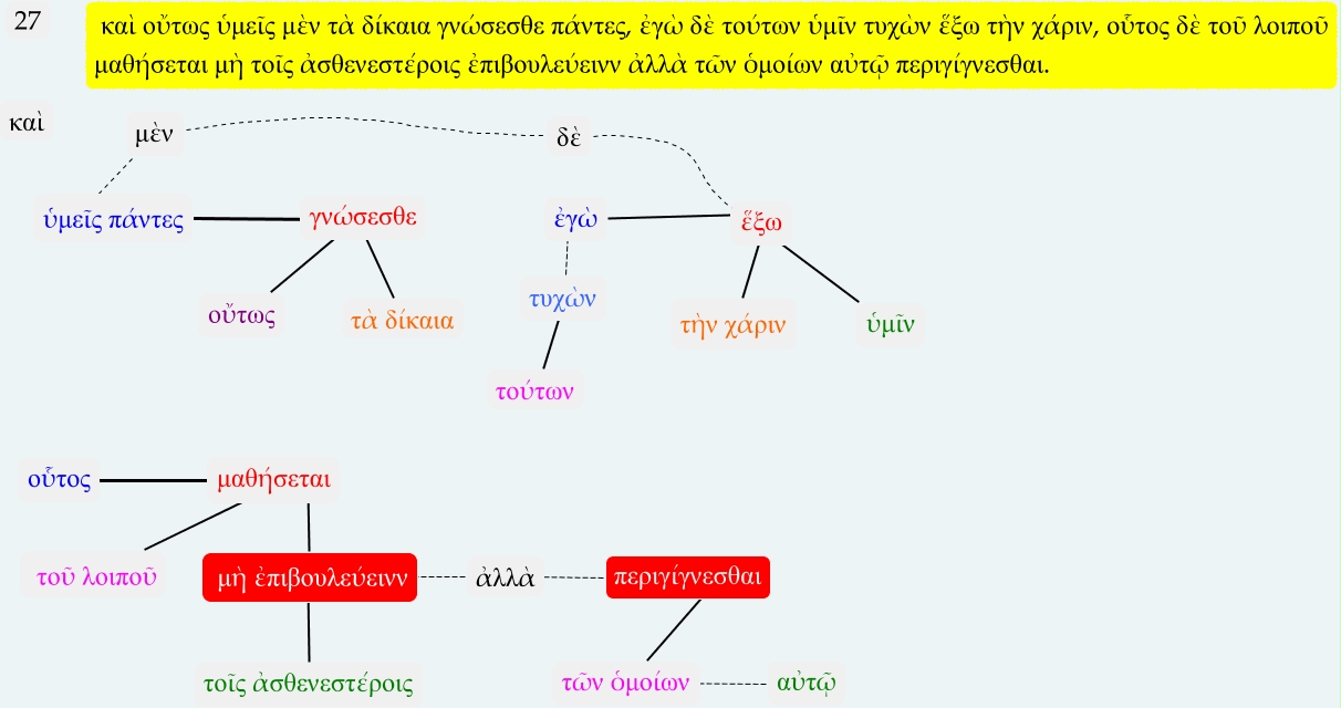 Este Cmap, tiene información relacionada con: frag. 27, μαθήσεται ???? οὗτος, τὴν χάριν ???? ἕξω, οὔτως ???? γνώσεσθε, μὴ ἐπιβουλεύεινν ???? μαθήσεται, ἀλλὰ ???? μὴ ἐπιβουλεύεινν, τῶν ὁμοίων ???? περιγίγνεσθαι, τοῦ λοιποῦ ???? μαθήσεται, ἐγὼ ???? ἕξω, αὐτῷ ???? τῶν ὁμοίων, μὲν ???? δὲ, τυχὼν ???? ἐγὼ, μὲν ???? ὑμεῖς πάντες, δὲ ???? ἕξω, ὑμεῖς πάντες ???? γνώσεσθε, τούτων ???? τυχὼν, τοῖς ἀσθενεστέροις ???? μὴ ἐπιβουλεύεινν, ὑμῖν ???? ἕξω, περιγίγνεσθαι ???? ἀλλὰ, τὰ δίκαια ???? γνώσεσθε