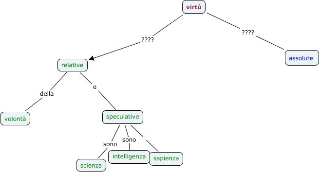 Questa Cmap, creata con IHMC CmapTools, contiene informazioni relative a: virtù, speculative sapienza, virtù ???? assolute, virtù ???? relative, speculative sono scienza, relative della volontà, speculative sono intelligenza, relative e speculative