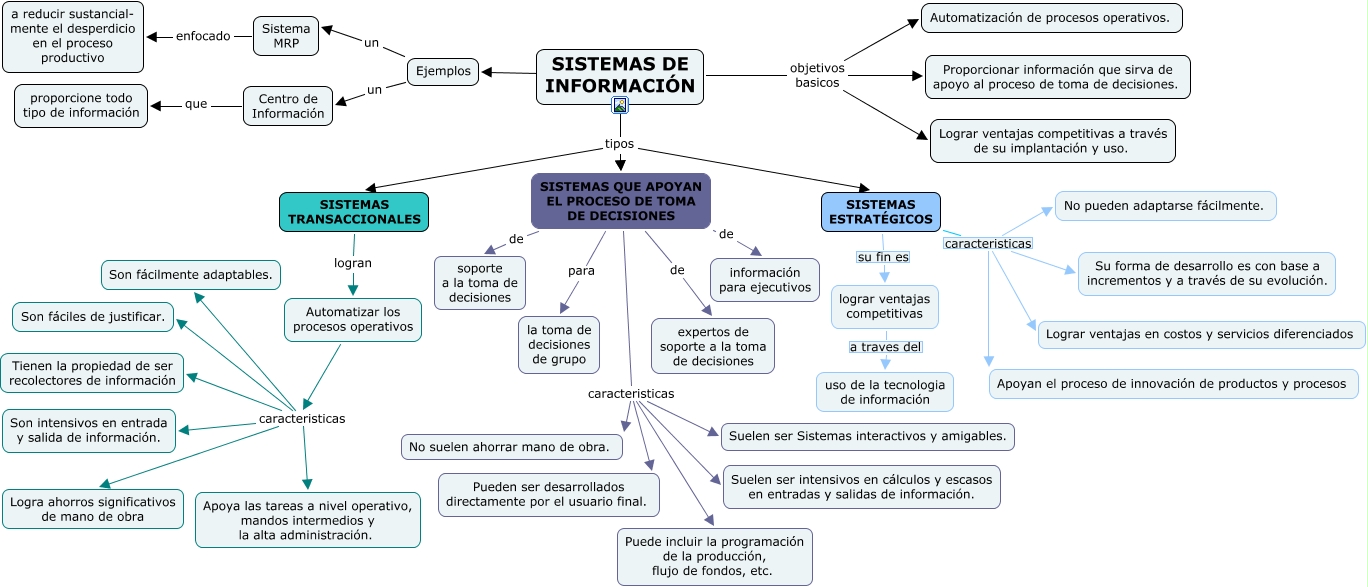 Este Cmap, tiene información relacionada con: SISTEMAS DE INFORMACIÓN, SISTEMAS QUE APOYAN EL PROCESO DE TOMA DE DECISIONES caracteristicas Puede incluir la programación de la producción, flujo de fondos, etc., SISTEMAS QUE APOYAN EL PROCESO DE TOMA DE DECISIONES de información para ejecutivos, lograr ventajas competitivas a traves del uso de la tecnologia de información, SISTEMAS ESTRATÉGICOS caracteristicas Su forma de desarrollo es con base a incrementos y a través de su evolución., SISTEMAS DE INFORMACIÓN ???? Ejemplos, SISTEMAS DE INFORMACIÓN tipos SISTEMAS QUE APOYAN EL PROCESO DE TOMA DE DECISIONES, SISTEMAS DE INFORMACIÓN objetivos basicos Proporcionar información que sirva de apoyo al proceso de toma de decisiones., Automatizar los procesos operativos caracteristicas Logra ahorros significativos de mano de obra, SISTEMAS DE INFORMACIÓN tipos SISTEMAS TRANSACCIONALES, Ejemplos un Sistema MRP, SISTEMAS DE INFORMACIÓN objetivos basicos Automatización de procesos operativos., Automatizar los procesos operativos caracteristicas Tienen la propiedad de ser recolectores de información, Automatizar los procesos operativos caracteristicas Son fácilmente adaptables., SISTEMAS QUE APOYAN EL PROCESO DE TOMA DE DECISIONES caracteristicas Suelen ser intensivos en cálculos y escasos en entradas y salidas de información., SISTEMAS DE INFORMACIÓN objetivos basicos Lograr ventajas competitivas a través de su implantación y uso., SISTEMAS ESTRATÉGICOS su fin es lograr ventajas competitivas, Ejemplos un Centro de Información, SISTEMAS QUE APOYAN EL PROCESO DE TOMA DE DECISIONES para la toma de decisiones de grupo, SISTEMAS ESTRATÉGICOS caracteristicas Lograr ventajas en costos y servicios diferenciados, SISTEMAS ESTRATÉGICOS caracteristicas No pueden adaptarse fácilmente.