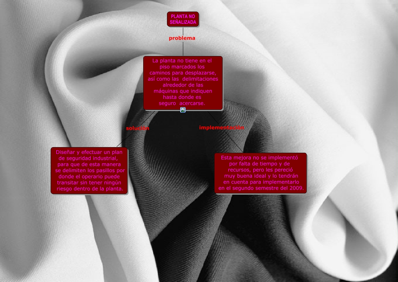 Este Cmap, tiene información relacionada con: PLANTA NO SEÑALIZADA, PLANTA NO SEÑALIZADA problema La planta no tiene en el piso marcados los caminos para desplazarse, así como las delimitaciones alrededor de las máquinas que indiquen hasta donde es seguro acercarse., La planta no tiene en el piso marcados los caminos para desplazarse, así como las delimitaciones alrededor de las máquinas que indiquen hasta donde es seguro acercarse. implementación Esta mejora no se implementó por falta de tiempo y de recursos, pero les pereció muy buena ideal y lo tendrán en cuenta para implementarlo en el segundo semestre del 2009., La planta no tiene en el piso marcados los caminos para desplazarse, así como las delimitaciones alrededor de las máquinas que indiquen hasta donde es seguro acercarse. solución Diseñar y efectuar un plan de seguridad industrial, para que de esta manera se delimiten los pasillos por donde el operario puede transitar sin tener ningún riesgo dentro de la planta.