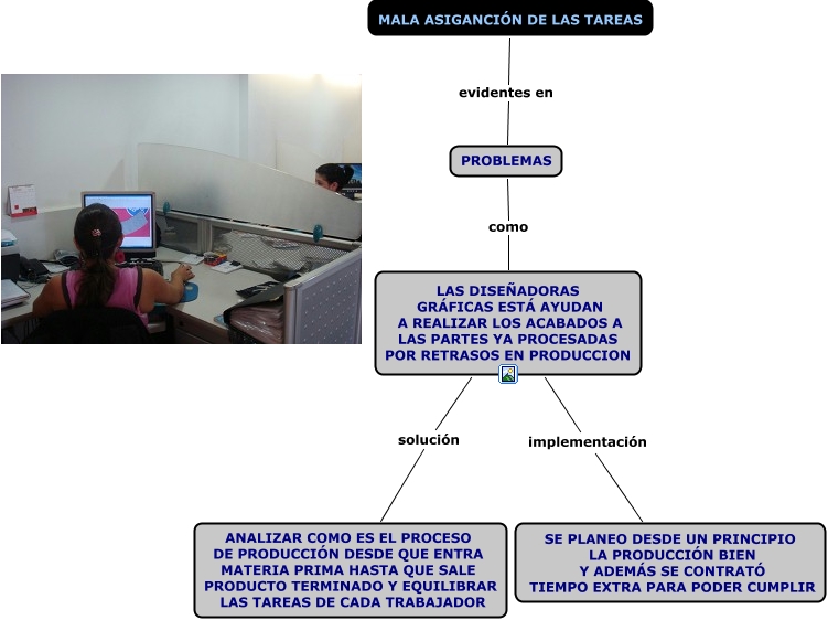Este Cmap, tiene información relacionada con: MALA ASIGNACION DE LAS TAREAS, PROBLEMAS como LAS DISEÑADORAS GRÁFICAS ESTÁ AYUDAN A REALIZAR LOS ACABADOS A LAS PARTES YA PROCESADAS POR RETRASOS EN PRODUCCION, MALA ASIGANCIÓN DE LAS TAREAS evidentes en PROBLEMAS, LAS DISEÑADORAS GRÁFICAS ESTÁ AYUDAN A REALIZAR LOS ACABADOS A LAS PARTES YA PROCESADAS POR RETRASOS EN PRODUCCION implementación SE PLANEO DESDE UN PRINCIPIO LA PRODUCCIÓN BIEN Y ADEMÁS SE CONTRATÓ TIEMPO EXTRA PARA PODER CUMPLIR, LAS DISEÑADORAS GRÁFICAS ESTÁ AYUDAN A REALIZAR LOS ACABADOS A LAS PARTES YA PROCESADAS POR RETRASOS EN PRODUCCION solución ANALIZAR COMO ES EL PROCESO DE PRODUCCIÓN DESDE QUE ENTRA MATERIA PRIMA HASTA QUE SALE PRODUCTO TERMINADO Y EQUILIBRAR LAS TAREAS DE CADA TRABAJADOR