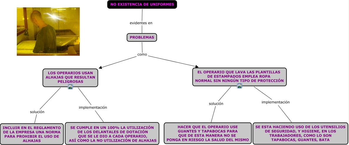 Este Cmap, tiene información relacionada con: NO EXISTENCIA DE UNIFORMES, LOS OPERARIOS USAN ALHAJAS QUE RESULTAN PELIGROSAS solución INCLUIR EN EL REGLAMENTO DE LA EMPRESA UNA NORMA PARA PROHIBIR EL USO DE ALHAJAS, PROBLEMAS como EL OPERARIO QUE LAVA LAS PLANTILLAS DE ESTAMPADOS EMPLEA ROPA NORMAL SIN NINGÚN TIPO DE PROTECCIÓN, NO EXISTENCIA DE UNIFORMES evidentes en PROBLEMAS, LOS OPERARIOS USAN ALHAJAS QUE RESULTAN PELIGROSAS implementación SE CUMPLE EN UN 100% LA UTILIZACIÓN DE LOS DELANTALES DE DOTACIÓN QUE SE LE DIO A CADA OPERARIO, ASÍ COMO LA NO UTILIZACIÓN DE ALHAJAS, EL OPERARIO QUE LAVA LAS PLANTILLAS DE ESTAMPADOS EMPLEA ROPA NORMAL SIN NINGÚN TIPO DE PROTECCIÓN solución HACER QUE EL OPERARIO USE GUANTES Y TAPABOCAS PARA QUE DE ESTA MANERA NO SE PONGA EN RIESGO LA SALUD DEL MISMO, PROBLEMAS como LOS OPERARIOS USAN ALHAJAS QUE RESULTAN PELIGROSAS, EL OPERARIO QUE LAVA LAS PLANTILLAS DE ESTAMPADOS EMPLEA ROPA NORMAL SIN NINGÚN TIPO DE PROTECCIÓN implementación SE ESTA HACIENDO USO DE LOS UTENSILIOS DE SEGURIDAD, Y HIGIENE, EN LOS TRABAJADORES, COMO LO SON TAPABOCAS, GUANTES, BATA