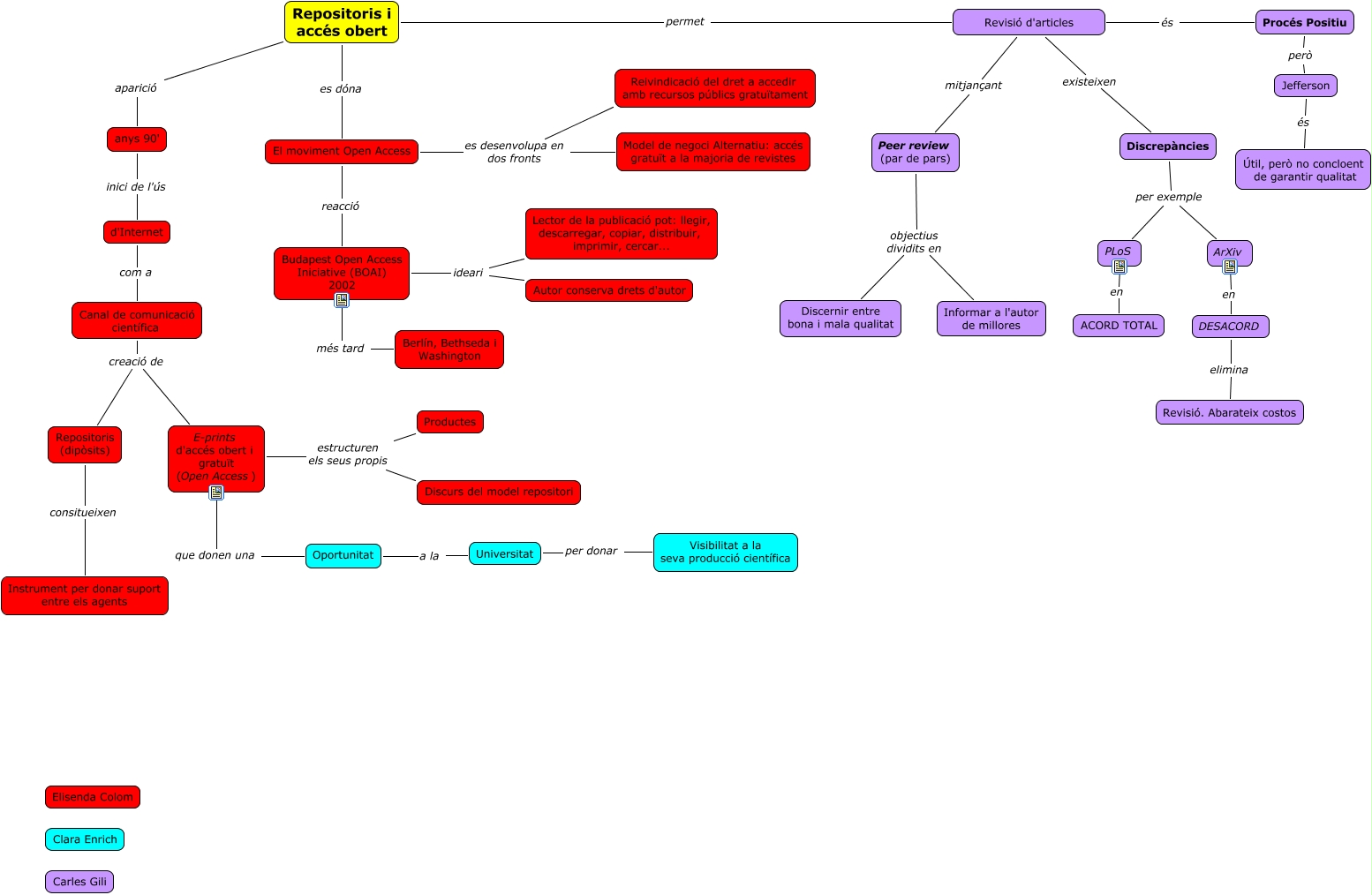 Este Cmap, tiene información relacionada con: Capítol 6, Repositoris i accés obert permet Revisió d'articles, Oportunitat a la Universitat, PLoS en ACORD TOTAL, DESACORD elimina Revisió. Abarateix costos, Revisió d'articles és Procés Positiu, El moviment Open Access es desenvolupa en dos fronts Model de negoci Alternatiu: accés gratuït a la majoria de revistes, Peer review (par de pars) objectius dividits en Informar a l'autor de millores, Revisió d'articles existeixen Discrepàncies, Budapest Open Access Iniciative (BOAI) 2002 més tard Berlín, Bethseda i Washington, Canal de comunicació científica creació de E-prints d'accés obert i gratuït (Open Access), Peer review (par de pars) objectius dividits en Discernir entre bona i mala qualitat, E-prints d'accés obert i gratuït (Open Access) estructuren els seus propis Productes, anys 90' inici de l'ús d'Internet, Repositoris i accés obert aparició anys 90', Repositoris (dipòsits) consitueixen Instrument per donar suport entre els agents, E-prints d'accés obert i gratuït (Open Access) estructuren els seus propis Discurs del model repositori, Discrepàncies per exemple ArXiv, El moviment Open Access reacció Budapest Open Access Iniciative (BOAI) 2002, Budapest Open Access Iniciative (BOAI) 2002 ideari Autor conserva drets d'autor, Budapest Open Access Iniciative (BOAI) 2002 ideari Lector de la publicació pot: llegir, descarregar, copiar, distribuir, imprimir, cercar...
