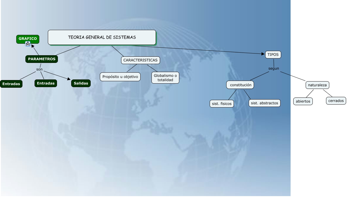Este Cmap, tiene información relacionada con: parametros, PARAMETROS ???? GRAFICO, PARAMETROS son Entradas, PARAMETROS son Entradas, CARACTERISTICAS ???? Globalismo o totalidad, TEORIA GENERAL DE SISTEMAS ???? CARACTERISTICAS, naturaleza ???? abiertos, CARACTERISTICAS ???? Propósito u objetivo, TIPOS segun naturaleza, constitución ???? sist. abstractos, constitución ???? sist. fisicos, naturaleza ???? cerrados, TEORIA GENERAL DE SISTEMAS ???? PARAMETROS, TIPOS segun constitución, PARAMETROS son Salidas, TEORIA GENERAL DE SISTEMAS sus TIPOS
