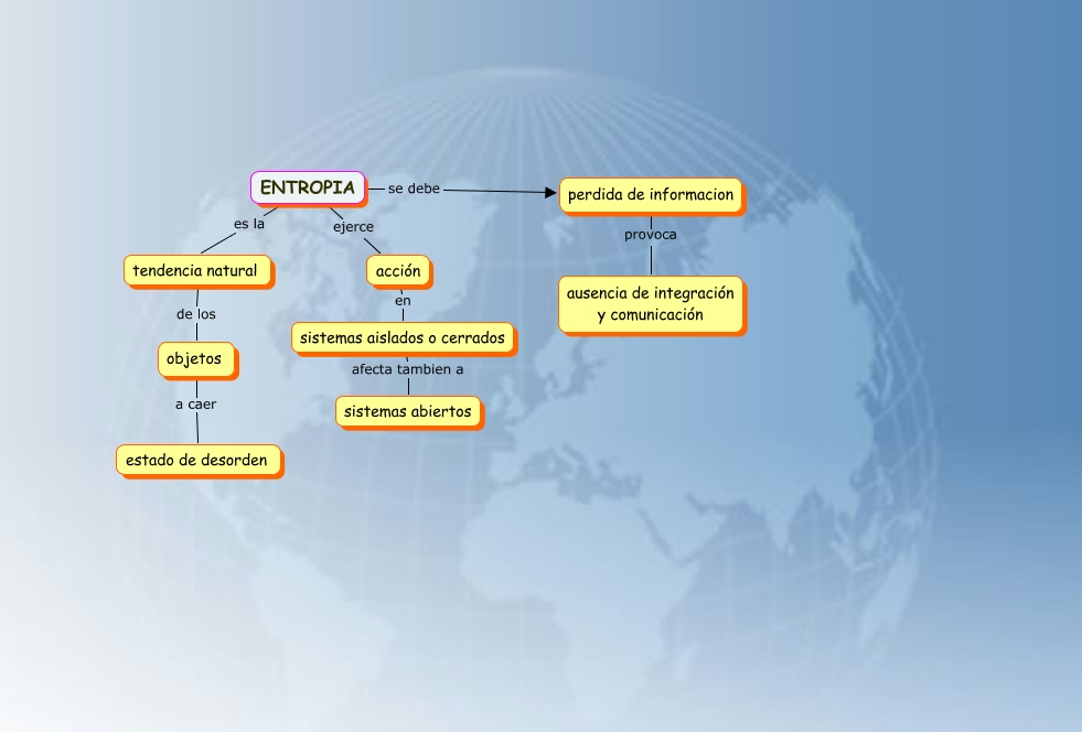 Este Cmap, tiene información relacionada con: entropia, ENTROPIA se debe perdida de informacion, sistemas aislados o cerrados afecta tambien a sistemas abiertos, ENTROPIA ejerce acción, ENTROPIA es la tendencia natural, perdida de informacion provoca ausencia de integración y comunicación, objetos a caer estado de desorden, acción en sistemas aislados o cerrados, tendencia natural de los objetos