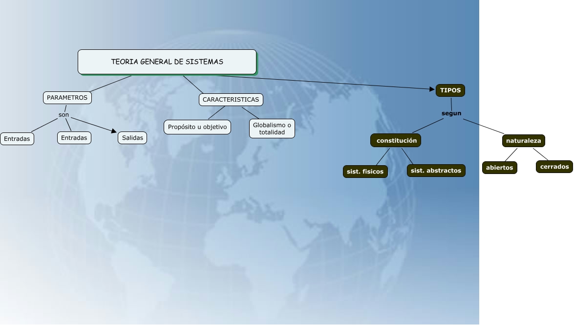 Este Cmap, tiene información relacionada con: tipos, TEORIA GENERAL DE SISTEMAS ???? CARACTERISTICAS, TIPOS segun constitución, constitución ???? sist. abstractos, TEORIA GENERAL DE SISTEMAS ???? PARAMETROS, TIPOS segun naturaleza, naturaleza ???? abiertos, CARACTERISTICAS ???? Globalismo o totalidad, PARAMETROS son Salidas, constitución ???? sist. fisicos, PARAMETROS son Entradas, naturaleza ???? cerrados, CARACTERISTICAS ???? Propósito u objetivo, TEORIA GENERAL DE SISTEMAS sus TIPOS, PARAMETROS son Entradas