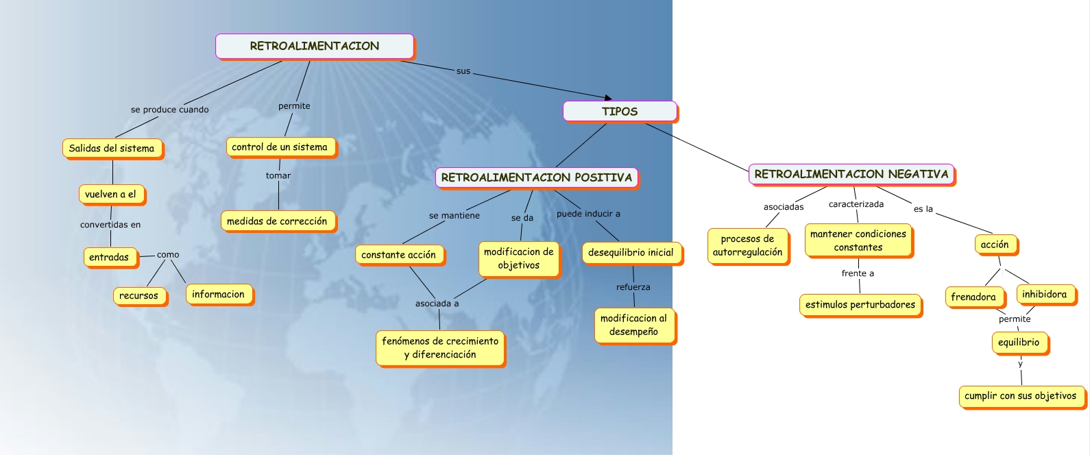Este Cmap, tiene información relacionada con: retroalimentacion, TIPOS ???? RETROALIMENTACION NEGATIVA, acción inhibidora, RETROALIMENTACION permite control de un sistema, RETROALIMENTACION sus TIPOS, vuelven a el convertidas en entradas, inhibidora permite equilibrio, modificacion de objetivos asociada a fenómenos de crecimiento y diferenciación, RETROALIMENTACION NEGATIVA es la acción, RETROALIMENTACION POSITIVA se mantiene constante acción, RETROALIMENTACION NEGATIVA caracterizada mantener condiciones constantes, entradas como informacion, constante acción asociada a fenómenos de crecimiento y diferenciación, RETROALIMENTACION POSITIVA se da modificacion de objetivos, Salidas del sistema ???? vuelven a el, entradas como recursos, mantener condiciones constantes frente a estimulos perturbadores, desequilibrio inicial refuerza modificacion al desempeño, equilibrio y cumplir con sus objetivos, RETROALIMENTACION NEGATIVA asociadas procesos de autorregulación, frenadora permite equilibrio