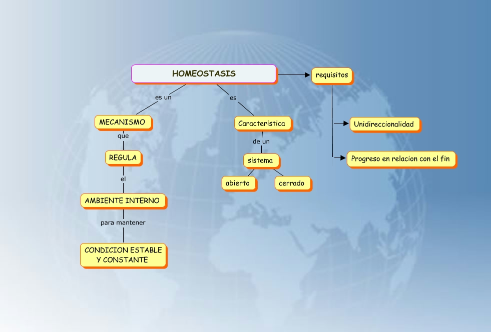 Este Cmap, tiene información relacionada con: homeostasis, HOMEOSTASIS ???? requisitos, requisitos Progreso en relacion con el fin, REGULA el AMBIENTE INTERNO, MECANISMO que REGULA, sistema ???? cerrado, sistema ???? abierto, HOMEOSTASIS es un MECANISMO, AMBIENTE INTERNO para mantener CONDICION ESTABLE Y CONSTANTE, HOMEOSTASIS es Caracteristica, requisitos Unidireccionalidad, Caracteristica de un sistema