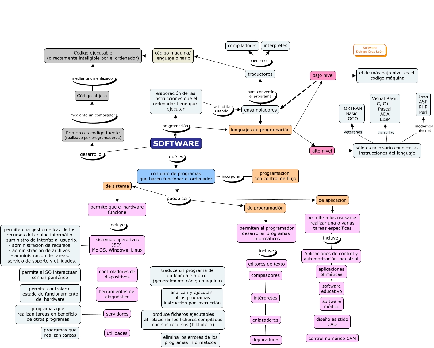 Este Cmap, tiene información relacionada con: software, bajo nivel ensambladores, lenguajes de programación bajo nivel, alto nivel sólo es necesario conocer las instrucciones del lenguaje, controladores de dispositivos herramientas de diagnóstico, conjunto de programas que hacen funcionar el ordenador incorporan programación con control de flujo, Aplicaciones de control y automatización industrial aplicaciones ofimáticas, conjunto de programas que hacen funcionar el ordenador puede ser de aplicación, depuradores elimina los errores de los programas informáticos, ensambladores para convertir el programa traductores, enlazadores produce ficheros ejecutables al relacionar los ficheros compilados con sus recursos (biblioteca), permiten al programador desarrollar programas informáticos incluye editores de texto, aplicaciones ofimáticas software educativo, compiladores traduce un programa de un lenguaje a otro (generalmente código máquina), sólo es necesario conocer las instrucciones del lenguaje actuales Visual Basic C, C++ Pascal ADA LISP, de programación permiten al programador desarrollar programas informáticos, conjunto de programas que hacen funcionar el ordenador puede ser de programación, traductores código máquina/ lenguaje binario, SOFTWARE qué es conjunto de programas que hacen funcionar el ordenador, permite que el hardware funcione incluye sistemas operativos (SO) Mc OS, Windows, Linux, software educativo software médico