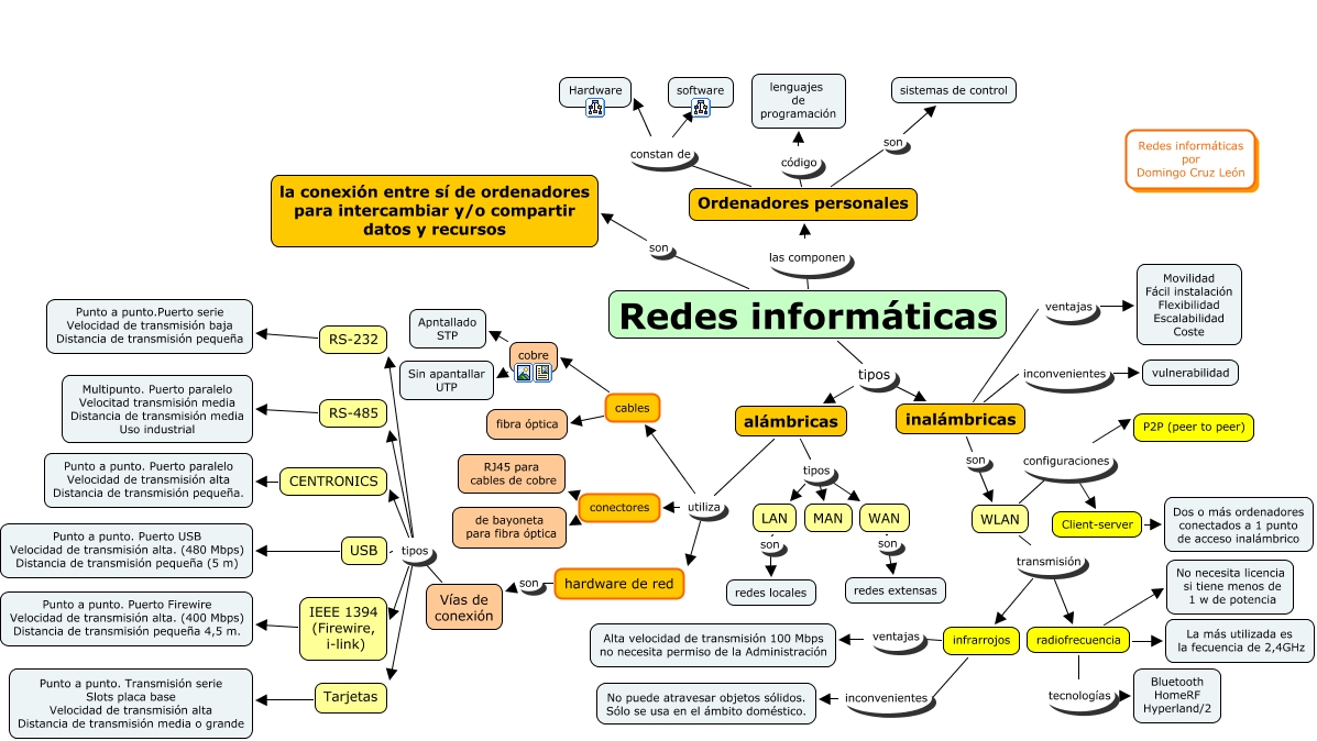 Este Cmap, tiene información relacionada con: redes informaticas, RS-232 Punto a punto.Puerto serie Velocidad de transmisión baja Distancia de transmisión pequeña, radiofrecuencia tecnologías Bluetooth HomeRF Hyperland/2, WLAN transmisión radiofrecuencia, Vías de conexión tipos RS-232, WAN son redes extensas, infrarrojos ventajas Alta velocidad de transmisión 100 Mbps no necesita permiso de la Administración, LAN son redes locales, Ordenadores personales son sistemas de control, alámbricas tipos WAN, Vías de conexión tipos Tarjetas, WLAN configuraciones P2P (peer to peer), cables fibra óptica, cobre Sin apantallar UTP, Redes informáticas tipos inalámbricas, Tarjetas Punto a punto. Transmisión serie Slots placa base Velocidad de transmisión alta Distancia de transmisión media o grande, USB Punto a punto. Puerto USB Velocidad de transmisión alta. (480 Mbps) Distancia de transmisión pequeña (5 m), infrarrojos inconvenientes No puede atravesar objetos sólidos. Sólo se usa en el ámbito doméstico., Redes informáticas las componen Ordenadores personales, Ordenadores personales código lenguajes de programación, inalámbricas ventajas Movilidad Fácil instalación Flexibilidad Escalabilidad Coste