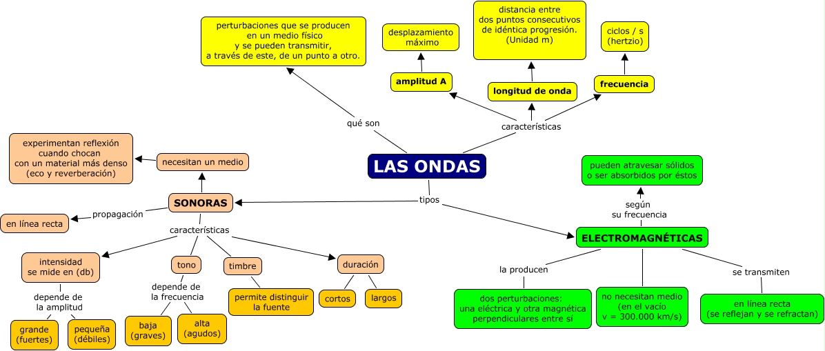Este Cmap, tiene información relacionada con: ondas, timbre permite distinguir la fuente, duración cortos, ELECTROMAGNÉTICAS se transmiten en línea recta (se reflejan y se refractan), ELECTROMAGNÉTICAS no necesitan medio (en el vacío v = 300.000 km/s), LAS ONDAS qué son perturbaciones que se producen en un medio físico y se pueden transmitir, a través de este, de un punto a otro., intensidad se mide en (db) depende de la amplitud pequeña (débiles), tono depende de la frecuencia alta (agudos), SONORAS características tono, intensidad se mide en (db) depende de la amplitud grande (fuertes), tono depende de la frecuencia baja (graves), longitud de onda distancia entre dos puntos consecutivos de idéntica progresión. (Unidad m), SONORAS propagación en línea recta, LAS ONDAS tipos SONORAS, LAS ONDAS tipos ELECTROMAGNÉTICAS, necesitan un medio experimentan reflexión cuando chocan con un material más denso (eco y reverberación), ELECTROMAGNÉTICAS según su frecuencia pueden atravesar sólidos o ser absorbidos por éstos, SONORAS características intensidad se mide en (db), SONORAS características duración, frecuencia ciclos / s (hertzio), SONORAS necesitan un medio