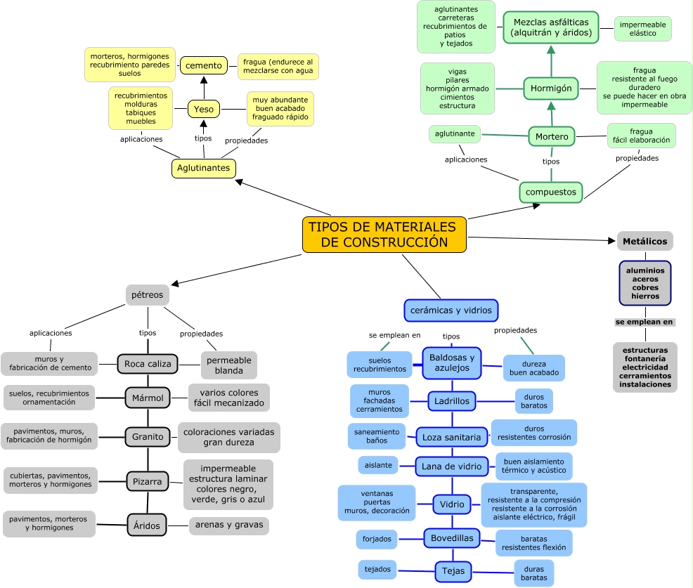 Este Cmap, tiene información relacionada con: tipos materiales, TIPOS DE MATERIALES DE CONSTRUCCIÓN Metálicos, Yeso muy abundante buen acabado fraguado rápido, TIPOS DE MATERIALES DE CONSTRUCCIÓN Aglutinantes, cerámicas y vidrios propiedades dureza buen acabado, Pizarra impermeable estructura laminar colores negro, verde, gris o azul, Bovedillas forjados, Baldosas y azulejos Ladrillos, Aglutinantes tipos Yeso, cerámicas y vidrios se emplean en suelos recubrimientos, Ladrillos muros fachadas cerramientos, Lana de vidrio buen aislamiento térmico y acústico, Baldosas y azulejos suelos recubrimientos, cerámicas y vidrios se emplean en suelos recubrimientos, Hormigón fragua resistente al fuego duradero se puede hacer en obra impermeable, Aglutinantes propiedades muy abundante buen acabado fraguado rápido, pétreos aplicaciones muros y fabricación de cemento, Bovedillas baratas resistentes flexión, Hormigón Mezclas asfálticas (alquitrán y áridos), Mármol varios colores fácil mecanizado, fragua fácil elaboración propiedades compuestos