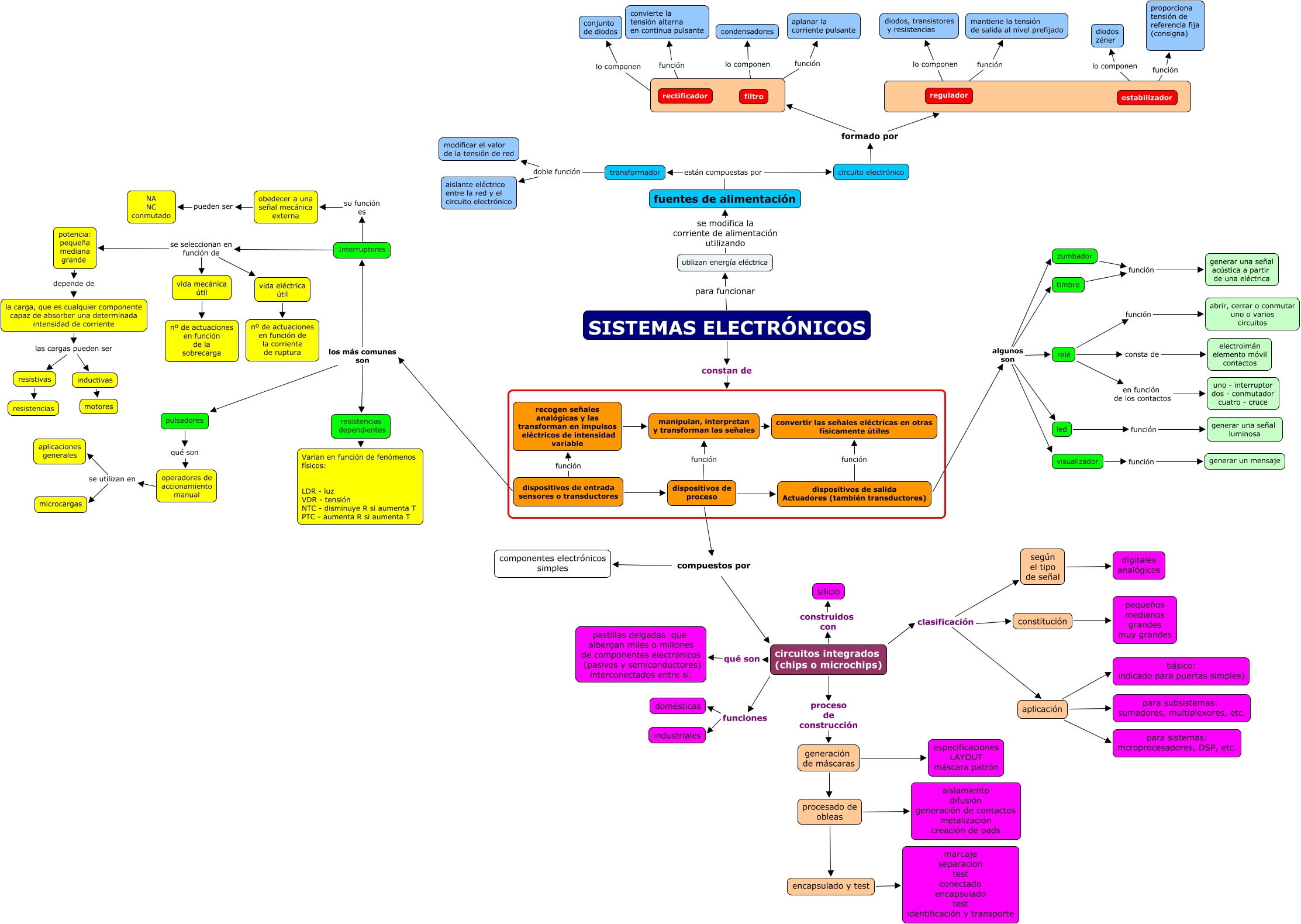 Este Cmap, tiene información relacionada con: sistemas electronicos, dispositivos de entrada sensores o transductores los más comunes son Interruptores, compuestos por componentes electrónicos simples, dispositivos de entrada sensores o transductores función recogen señales analógicas y las transforman en impulsos eléctricos de intensidad variable, generación de máscaras especificaciones LAYOUT máscara patrón, procesado de obleas encapsulado y test, fuentes de alimentación están compuestas por circuito electrónico, dispositivos de entrada sensores o transductores los más comunes son pulsadores, fuentes de alimentación están compuestas por transformador, Interruptores se seleccionan en función de potencia: pequeña mediana grande, compuestos por circuitos integrados (chips o microchips), resistencias dependientes Varían en función de fenómenos físicos: LDR - luz VDR - tensión NTC - disminuye R si aumenta T PTC - aumenta R si aumenta T, dispositivos de entrada sensores o transductores los más comunes son resistencias dependientes, transformador doble función aislante eléctrico entre la red y el circuito electrónico, SISTEMAS ELECTRÓNICOS para funcionar utilizan energía eléctrica, potencia: pequeña mediana grande depende de la carga, que es cualquier componente capaz de absorber una determinada intensidad de corriente, rectificador lo componen conjunto de diodos, transformador doble función modificar el valor de la tensión de red, dispositivos de salida Actuadores (también transductores) algunos son relé, recogen señales analógicas y las transforman en impulsos eléctricos de intensidad variable manipulan, interpretan y transforman las señales, aplicación para sistemas: mcroprocesadores, DSP, etc.