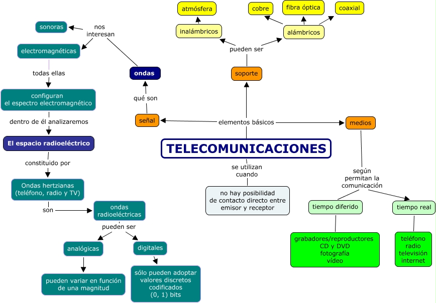 Este Cmap, tiene información relacionada con: telecomunicaciones, alámbricos coaxial, TELECOMUNICACIONES se utilizan cuando no hay posibilidad de contacto directo entre emisor y receptor, digitales sólo pueden adoptar valores discretos codificados (0, 1) bits, tiempo real teléfono radio televisión internet, ondas nos interesan electromagnéticas, TELECOMUNICACIONES elementos básicos señal, alámbricos fibra óptica, soporte pueden ser alámbricos, Ondas hertzianas (teléfono, radio y TV) son ondas radioeléctricas, El espacio radioeléctrico constituido por Ondas hertzianas (teléfono, radio y TV), ondas radioeléctricas pueden ser analógicas, medios según permitan la comunicación tiempo diferido, soporte pueden ser inalámbricos, tiempo diferido grabadores/reproductores CD y DVD fotografía vídeo, medios según permitan la comunicación tiempo real, configuran el espectro electromagnético dentro de él analizaremos El espacio radioeléctrico, ondas radioeléctricas pueden ser digitales, electromagnéticas todas ellas configuran el espectro electromagnético, analógicas pueden variar en función de una magnitud, señal qué son ondas