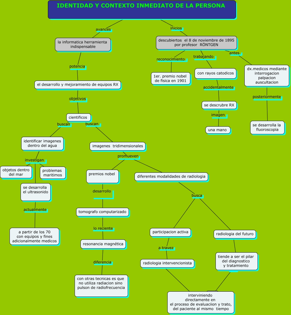 Este Cmap, tiene información relacionada con: DESARROLLO DE LA RIOLOGIA, identificar imagenes dentro del agua investigan problemas maritimos, premios nobel desarrollo tomografo computarizado, descubiertos el 8 de noviembre de 1895 por profesor RÖNTGEN trabajando con rayos catodicos, IDENTIDAD Y CONTEXTO INMEDIATO DE LA PERSONA inicios descubiertos el 8 de noviembre de 1895 por profesor RÖNTGEN, imagenes tridimensionales promueven diferentes modalidades de radiologia, descubiertos el 8 de noviembre de 1895 por profesor RÖNTGEN reconocimiento 1er. premio nobel de fisica en 1901, tomografo computarizado lo reciente resonancia magnética, identificar imagenes dentro del agua investigan objetos dentro del mar, cientificos buscan identificar imagenes dentro del agua, el desarrollo y mejoramiento de equipos RX objetivos cientificos, con rayos catodicos accidentalmente se descrubre RX, participacion activa a travez radiologia intervencionista, radiologia del futuro ???? tiende a ser el pilar del diagnostico y tratamiento, diferentes modalidades de radiologia busca participacion activa, descubiertos el 8 de noviembre de 1895 por profesor RÖNTGEN antes dx.medicos mediante interrogacion palpacion auscultacion, la informatica herramienta indispensable potencia el desarrollo y mejoramiento de equipos RX, diferentes modalidades de radiologia busca radiologia del futuro, identificar imagenes dentro del agua investigan se desarrolla el ultrasonido, dx.medicos mediante interrogacion palpacion auscultacion posteriormente se desarrolla la fluoroscopia, cientificos buscan imagenes tridimensionales