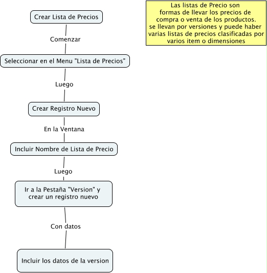 Este Cmap, tiene información relacionada con: Lista de Precios, Crear Lista de Precios Comenzar Seleccionar en el Menu "Lista de Precios", Ir a la Pestaña "Version" y crear un registro nuevo Con datos Incluir los datos de la version, Crear Registro Nuevo En la Ventana Incluir Nombre de Lista de Precio, Incluir Nombre de Lista de Precio Luego Ir a la Pestaña "Version" y crear un registro nuevo, Seleccionar en el Menu "Lista de Precios" Luego Crear Registro Nuevo