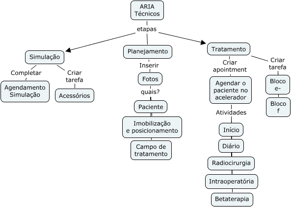 Esse mapa conceitual, produzido no IHMC CmapTools, tem a informação relacionada a: Aria Tecnicos, Agendar o paciente no acelerador Atividades Diário, Agendar o paciente no acelerador Atividades Intraoperatória, Fotos quais? Imobilização e posicionamento, Agendar o paciente no acelerador Atividades Início, Simulação Criar tarefa Acessórios, Planejamento Inserir Fotos, Fotos quais? Paciente, Tratamento Criar apointment Agendar o paciente no acelerador, ARIA Técnicos etapas Tratamento, Fotos quais? Campo de tratamento, Tratamento Criar tarefa Bloco e-, Tratamento Criar tarefa Bloco f, Simulação Completar Agendamento Simulação, Agendar o paciente no acelerador Atividades Radiocirurgia, ARIA Técnicos etapas Simulação, ARIA Técnicos etapas Planejamento, Agendar o paciente no acelerador Atividades Betaterapia
