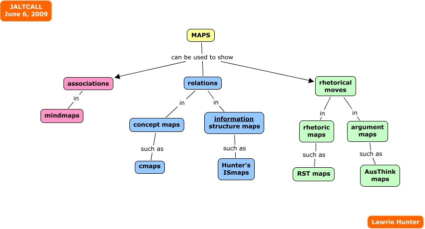This Concept Map, created with IHMC CmapTools, has information related to: map types (JALTCALL 09), MAPS can be used to show rhetorical moves, MAPS can be used to show associations, associations in mindmaps, relations in concept maps, relations in information structure maps, concept maps such as cmaps, MAPS can be used to show relations, rhetoric maps such as RST maps, information structure maps such as Hunter's ISmaps, rhetorical moves in argument maps, rhetorical moves in rhetoric maps, argument maps such as AusThink maps