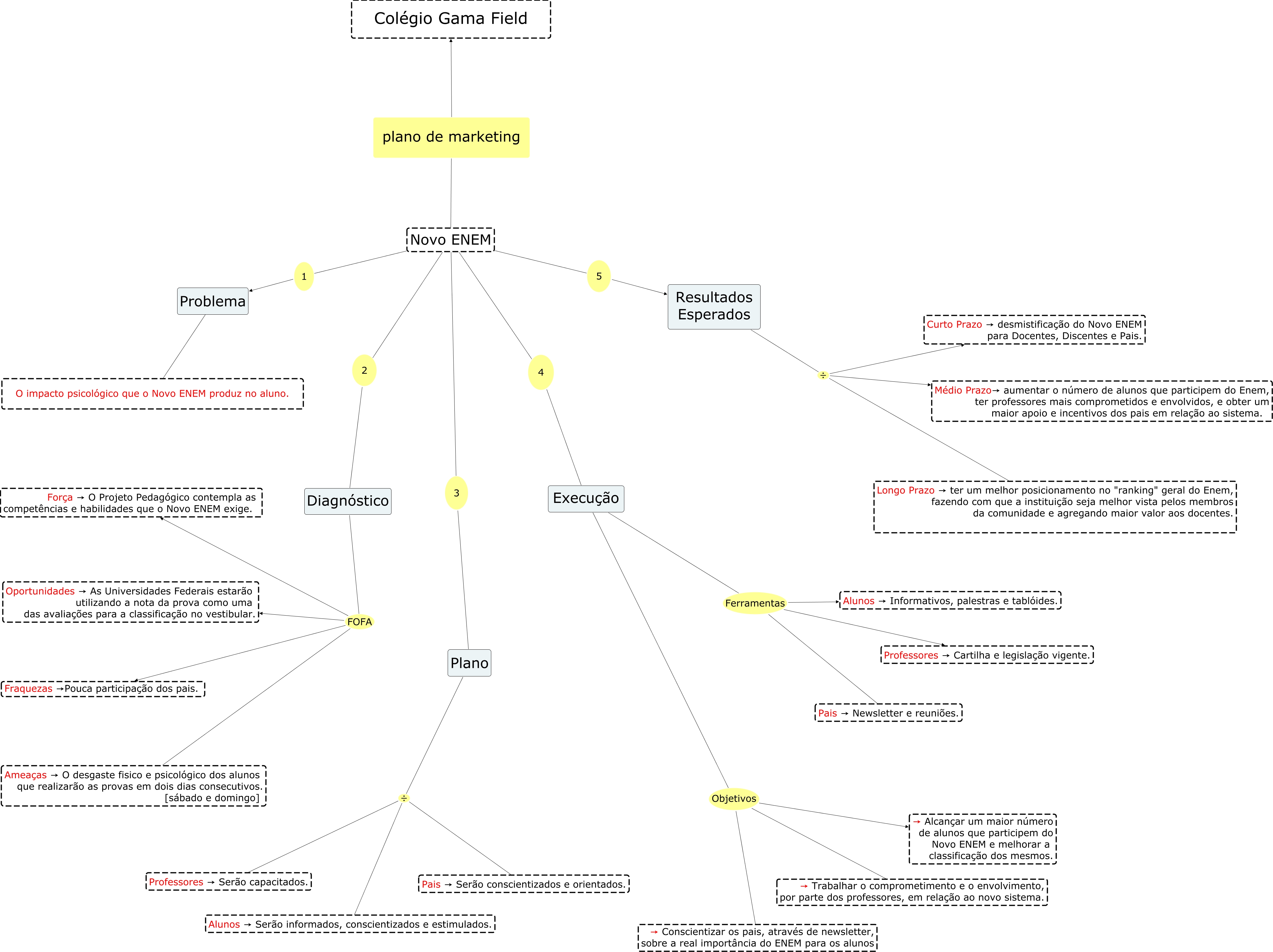 Esse mapa conceitual, produzido no IHMC CmapTools, tem a informação relacionada a: Plano de Marketing, Diagnóstico FOFA Oportunidades → As Universidades Federais estarão utilizando a nota da prova como uma das avaliações para a classificação no vestibular., Diagnóstico FOFA Fraquezas →Pouca participação dos pais., Novo ENEM 2 Diagnóstico, Plano ÷ Professores → Serão capacitados., Execução Objetivos → Trabalhar o comprometimento e o envolvimento, por parte dos professores, em relação ao novo sistema., Novo ENEM 5 Resultados Esperados, Resultados Esperados ÷ Longo Prazo → ter um melhor posicionamento no "ranking" geral do Enem, fazendo com que a instituição seja melhor vista pelos membros da comunidade e agregando maior valor aos docentes., Resultados Esperados ÷ Médio Prazo→ aumentar o número de alunos que participem do Enem, ter professores mais comprometidos e envolvidos, e obter um maior apoio e incentivos dos pais em relação ao sistema., Execução Ferramentas Pais → Newsletter e reuniões., Resultados Esperados ÷ Curto Prazo → desmistificação do Novo ENEM para Docentes, Discentes e Pais., Execução Objetivos → Alcançar um maior número de alunos que participem do Novo ENEM e melhorar a classificação dos mesmos., Plano ÷ Pais → Serão conscientizados e orientados., Diagnóstico FOFA Força → O Projeto Pedagógico contempla as competências e habilidades que o Novo ENEM exige., Problema O impacto psicológico que o Novo ENEM produz no aluno., Execução Ferramentas Alunos → Informativos, palestras e tablóides., Novo ENEM plano de marketing Colégio Gama Field, Diagnóstico FOFA Ameaças → O desgaste fisico e psicológico dos alunos que realizarão as provas em dois dias consecutivos. [sábado e domingo], Plano ÷ Alunos → Serão informados, conscientizados e estimulados., Novo ENEM 1 Problema, Novo ENEM 4 Execução