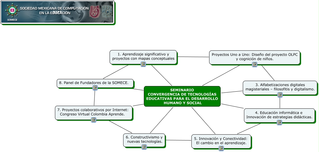 Este Cmap, tiene información relacionada con: somece_seminario, SEMINARIO CONVERGENCIA DE TECNOLOGÍAS EDUCATIVAS PARA EL DESARROLLO HUMANO Y SOCIAL ???? 7. Proyectos colaborativos por Internet: Congreso Virtual Colombia Aprende., 7. Proyectos colaborativos por Internet: Congreso Virtual Colombia Aprende. 8. Panel de Fundadores de la SOMECE., SEMINARIO CONVERGENCIA DE TECNOLOGÍAS EDUCATIVAS PARA EL DESARROLLO HUMANO Y SOCIAL 3. Alfabetizaciones digitales magisteriales – filosofitis y digitalismo., SEMINARIO CONVERGENCIA DE TECNOLOGÍAS EDUCATIVAS PARA EL DESARROLLO HUMANO Y SOCIAL 5. Innovación y Conectividad: El cambio en el aprendizaje., 8. Panel de Fundadores de la SOMECE. 1. Aprendizaje significativo y proyectos con mapas conceptuales, Proyectos Uno a Uno: Diseño del proyecto OLPC y cognición de niños. 3. Alfabetizaciones digitales magisteriales – filosofitis y digitalismo., 6. Constructivismo y nuevas tecnologías. 7. Proyectos colaborativos por Internet: Congreso Virtual Colombia Aprende., 5. Innovación y Conectividad: El cambio en el aprendizaje. 6. Constructivismo y nuevas tecnologías., SEMINARIO CONVERGENCIA DE TECNOLOGÍAS EDUCATIVAS PARA EL DESARROLLO HUMANO Y SOCIAL 8. Panel de Fundadores de la SOMECE., SEMINARIO CONVERGENCIA DE TECNOLOGÍAS EDUCATIVAS PARA EL DESARROLLO HUMANO Y SOCIAL 1. Aprendizaje significativo y proyectos con mapas conceptuales, 1. Aprendizaje significativo y proyectos con mapas conceptuales Proyectos Uno a Uno: Diseño del proyecto OLPC y cognición de niños., SEMINARIO CONVERGENCIA DE TECNOLOGÍAS EDUCATIVAS PARA EL DESARROLLO HUMANO Y SOCIAL Proyectos Uno a Uno: Diseño del proyecto OLPC y cognición de niños., SEMINARIO CONVERGENCIA DE TECNOLOGÍAS EDUCATIVAS PARA EL DESARROLLO HUMANO Y SOCIAL 4. Educación informática e Innovación de estrategias didácticas., 3. Alfabetizaciones digitales magisteriales – filosofitis y digitalismo. 4. Educación informática e Innovación de estrategias didácticas., 4. Educación informática e Innovación de estrategias didácticas. 5. Innovación y Conectividad: El cambio en el aprendizaje., SEMINARIO CONVERGENCIA DE TECNOLOGÍAS EDUCATIVAS PARA EL DESARROLLO HUMANO Y SOCIAL 6. Constructivismo y nuevas tecnologías.