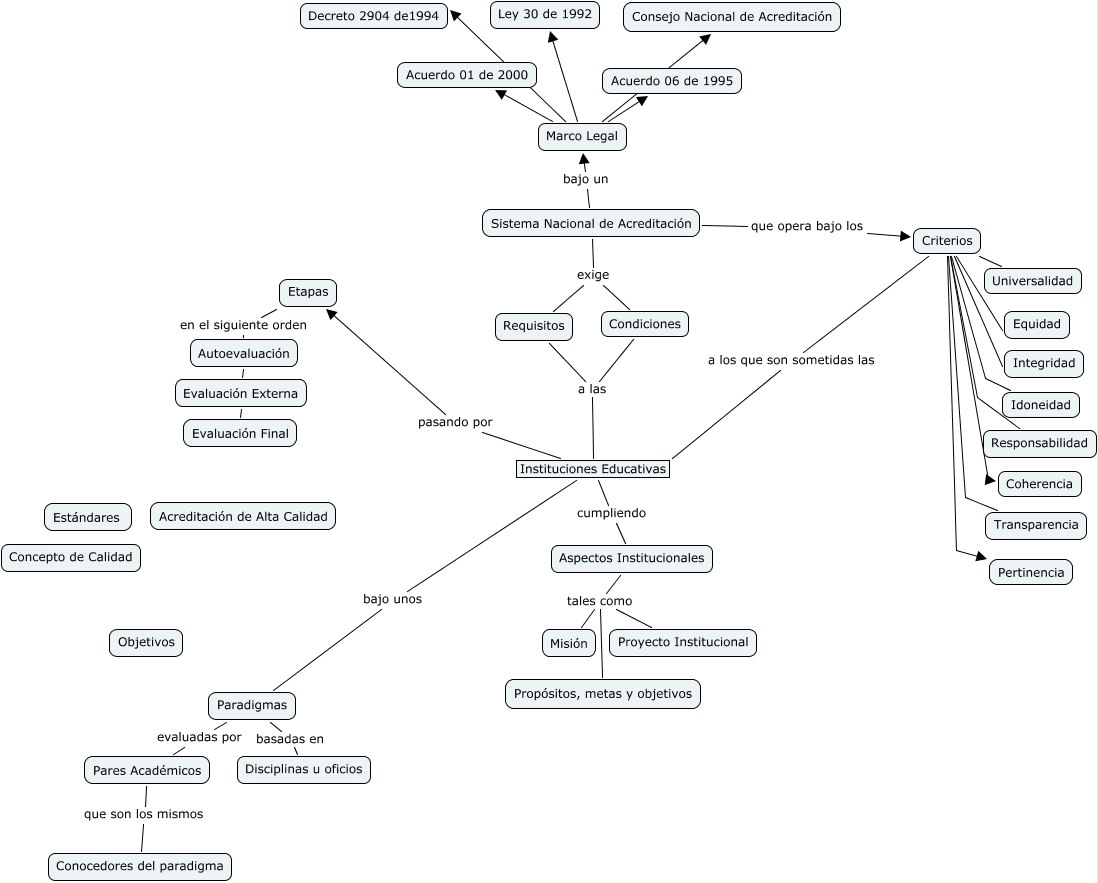 Este Cmap, tiene información relacionada con: Junio 24, Pares Académicos que son los mismos Conocedores del paradigma, Aspectos Institucionales tales como Proyecto Institucional, Aspectos Institucionales tales como Misión, Paradigmas basadas en Disciplinas u oficios, Etapas en el siguiente orden Autoevaluación, Marco Legal Acuerdo 06 de 1995, Criterios Equidad, Criterios Idoneidad, Marco Legal Consejo Nacional de Acreditación, Autoevaluación Evaluación Externa, Instituciones Educativas cumpliendo Aspectos Institucionales, Sistema Nacional de Acreditación que opera bajo los Criterios, Marco Legal Acuerdo 01 de 2000, Sistema Nacional de Acreditación bajo un Marco Legal, Criterios a los que son sometidas las Instituciones Educativas, Marco Legal Decreto 2904 de1994, Aspectos Institucionales tales como Propósitos, metas y objetivos, Requisitos a las Instituciones Educativas, Instituciones Educativas bajo unos Paradigmas, Evaluación Externa Evaluación Final