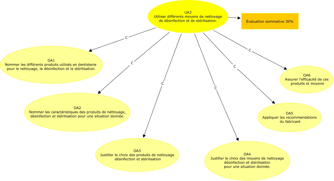Cette carte de concepts créée avec IHMC CmapTools traite de: UA3, UA3 Utiliser différents moyens de nettoyage de désinfection et de stérilisation. C OA4 Justifier le choix des moyens de nettoyage désinfection et stérilisation pour une situation donnée., UA3 Utiliser différents moyens de nettoyage de désinfection et de stérilisation. ???? Évaluation sommative 30%, UA3 Utiliser différents moyens de nettoyage de désinfection et de stérilisation. C OA2 Nommer les caractéristiques des produits de nettoyage, désinfection et stérilisation pour une situation donnée., UA3 Utiliser différents moyens de nettoyage de désinfection et de stérilisation. C OA6 Assurer l'efficacité de ces produits et moyens, UA3 Utiliser différents moyens de nettoyage de désinfection et de stérilisation. C OA3 Justifier le choix des produits de nettoyage désinfection et stérilisation, UA3 Utiliser différents moyens de nettoyage de désinfection et de stérilisation. C OA5 Appliquer les recommandations du fabricant, UA3 Utiliser différents moyens de nettoyage de désinfection et de stérilisation. C OA1 Nommer les différents produits utilisés en dentisterie pour le nettoyage, la désinfection et la stérilisation.