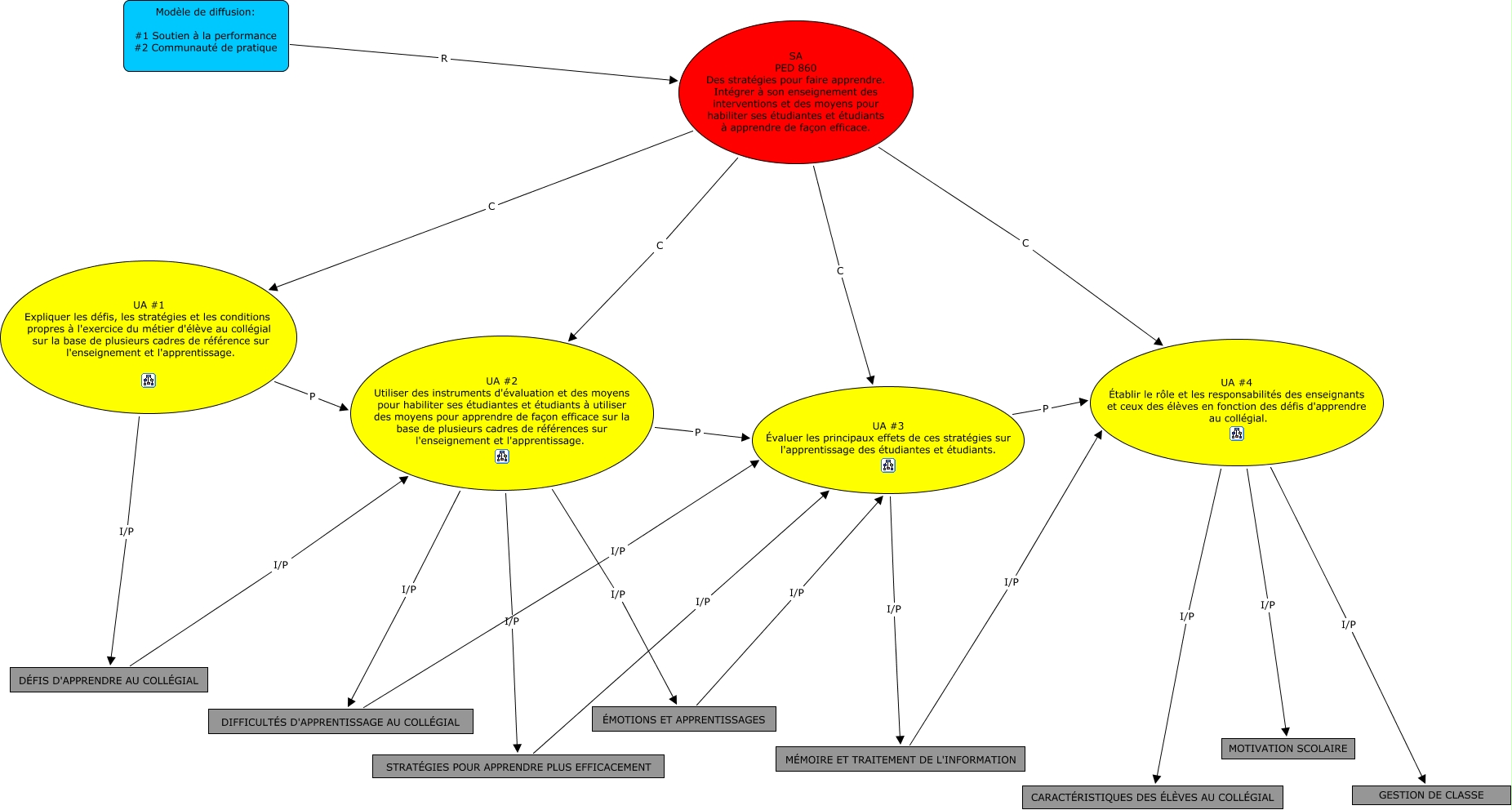 Cette carte de concepts créée avec IHMC CmapTools traite de: PED 860-SA, UA #2 Utiliser des instruments d'évaluation et des moyens pour habiliter ses étudiantes et étudiants à utiliser des moyens pour apprendre de façon efficace sur la base de plusieurs cadres de références sur l'enseignement et l'apprentissage. I/P ÉMOTIONS ET APPRENTISSAGES, UA #4 Établir le rôle et les responsabilités des enseignants et ceux des élèves en fonction des défis d'apprendre au collégial. I/P GESTION DE CLASSE, SA PED 860 Des stratégies pour faire apprendre. Intégrer à son enseignement des interventions et des moyens pour habiliter ses étudiantes et étudiants à apprendre de façon efficace. C UA #4 Établir le rôle et les responsabilités des enseignants et ceux des élèves en fonction des défis d'apprendre au collégial., SA PED 860 Des stratégies pour faire apprendre. Intégrer à son enseignement des interventions et des moyens pour habiliter ses étudiantes et étudiants à apprendre de façon efficace. C UA #3 Évaluer les principaux effets de ces stratégies sur l'apprentissage des étudiantes et étudiants., UA #2 Utiliser des instruments d'évaluation et des moyens pour habiliter ses étudiantes et étudiants à utiliser des moyens pour apprendre de façon efficace sur la base de plusieurs cadres de références sur l'enseignement et l'apprentissage. I/P STRATÉGIES POUR APPRENDRE PLUS EFFICACEMENT, UA #3 Évaluer les principaux effets de ces stratégies sur l'apprentissage des étudiantes et étudiants. I/P MÉMOIRE ET TRAITEMENT DE L'INFORMATION, UA #4 Établir le rôle et les responsabilités des enseignants et ceux des élèves en fonction des défis d'apprendre au collégial. I/P MOTIVATION SCOLAIRE, Modèle de diffusion: #1 Soutien à la performance #2 Communauté de pratique R SA PED 860 Des stratégies pour faire apprendre. Intégrer à son enseignement des interventions et des moyens pour habiliter ses étudiantes et étudiants à apprendre de façon efficace., DIFFICULTÉS D'APPRENTISSAGE AU COLLÉGIAL I/P UA #3 Évaluer les principaux effets de ces stratégies sur l'apprentissage des étudiantes et étudiants., UA #3 Évaluer les principaux effets de ces stratégies sur l'apprentissage des étudiantes et étudiants. P UA #4 Établir le rôle et les responsabilités des enseignants et ceux des élèves en fonction des défis d'apprendre au collégial., UA #2 Utiliser des instruments d'évaluation et des moyens pour habiliter ses étudiantes et étudiants à utiliser des moyens pour apprendre de façon efficace sur la base de plusieurs cadres de références sur l'enseignement et l'apprentissage. I/P DIFFICULTÉS D'APPRENTISSAGE AU COLLÉGIAL, SA PED 860 Des stratégies pour faire apprendre. Intégrer à son enseignement des interventions et des moyens pour habiliter ses étudiantes et étudiants à apprendre de façon efficace. C UA #2 Utiliser des instruments d'évaluation et des moyens pour habiliter ses étudiantes et étudiants à utiliser des moyens pour apprendre de façon efficace sur la base de plusieurs cadres de références sur l'enseignement et l'apprentissage., UA #2 Utiliser des instruments d'évaluation et des moyens pour habiliter ses étudiantes et étudiants à utiliser des moyens pour apprendre de façon efficace sur la base de plusieurs cadres de références sur l'enseignement et l'apprentissage. P UA #3 Évaluer les principaux effets de ces stratégies sur l'apprentissage des étudiantes et étudiants., UA #1 Expliquer les défis, les stratégies et les conditions propres à l'exercice du métier d'élève au collégial sur la base de plusieurs cadres de référence sur l'enseignement et l'apprentissage. P UA #2 Utiliser des instruments d'évaluation et des moyens pour habiliter ses étudiantes et étudiants à utiliser des moyens pour apprendre de façon efficace sur la base de plusieurs cadres de références sur l'enseignement et l'apprentissage., DÉFIS D'APPRENDRE AU COLLÉGIAL I/P UA #2 Utiliser des instruments d'évaluation et des moyens pour habiliter ses étudiantes et étudiants à utiliser des moyens pour apprendre de façon efficace sur la base de plusieurs cadres de références sur l'enseignement et l'apprentissage., MÉMOIRE ET TRAITEMENT DE L'INFORMATION I/P UA #4 Établir le rôle et les responsabilités des enseignants et ceux des élèves en fonction des défis d'apprendre au collégial., SA PED 860 Des stratégies pour faire apprendre. Intégrer à son enseignement des interventions et des moyens pour habiliter ses étudiantes et étudiants à apprendre de façon efficace. C UA #1 Expliquer les défis, les stratégies et les conditions propres à l'exercice du métier d'élève au collégial sur la base de plusieurs cadres de référence sur l'enseignement et l'apprentissage., ÉMOTIONS ET APPRENTISSAGES I/P UA #3 Évaluer les principaux effets de ces stratégies sur l'apprentissage des étudiantes et étudiants., STRATÉGIES POUR APPRENDRE PLUS EFFICACEMENT I/P UA #3 Évaluer les principaux effets de ces stratégies sur l'apprentissage des étudiantes et étudiants., UA #1 Expliquer les défis, les stratégies et les conditions propres à l'exercice du métier d'élève au collégial sur la base de plusieurs cadres de référence sur l'enseignement et l'apprentissage. I/P DÉFIS D'APPRENDRE AU COLLÉGIAL