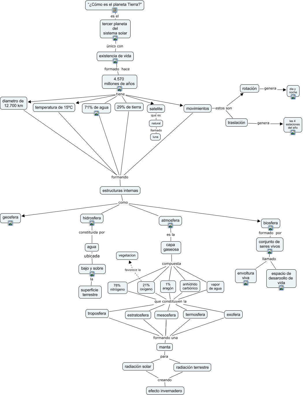 Este Cmap, tiene información relacionada con: EL PLANETA TIERRA, rotación genera dia y noche, estratosfera formando una manta, 1% aragón que constituyen la mesosfera, temperatura de 15ºC formando estructuras internas, 4.570 millones de años tiene 71% de agua, conjunto de seres vivos llamado espacio de desaroollo de vida, satelite que es natural, 4.570 millones de años tiene 29% de tierra, mesosfera formando una manta, exofera formando una manta, troposfera que constituyen la mesosfera, capa gaseosa compuesta 21% oxígeno, manta para radiación terrestre, estructuras internas como geosfera, termosfera que constituyen la mesosfera, conjunto de seres vivos llamado envoltura viva, 4.570 millones de años tiene temperatura de 15ºC, 4.570 millones de años tiene movimientos, 21% oxígeno que constituyen la mesosfera, troposfera formando una manta