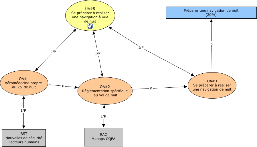 Cette carte de concepts créée avec IHMC CmapTools traite de: UA_5 Se préparer à réaliser une navigation à vue de nuit, OA#1 Aéromédecine propre au vol de nuit P OA#2 Règlementation spécifique au vol de nuit, OA#3 Se préparer à réaliser une navigation de nuit R Préparer une navigation de nuit (20%)