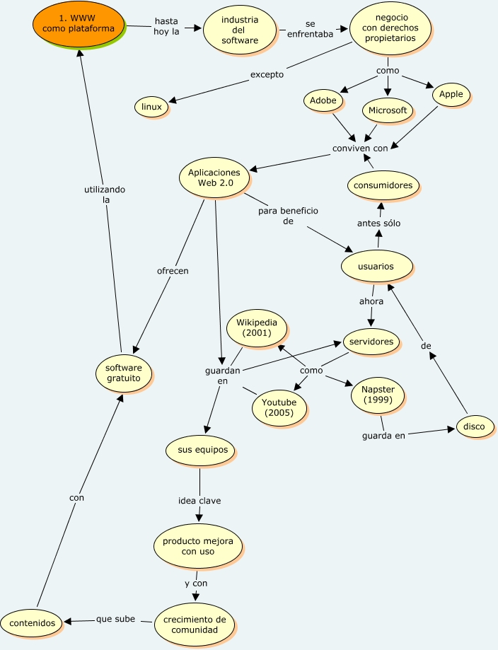 Este Cmap, tiene información relacionada con: Principio 1 -María José, servidores como Napster (1999), negocio con derechos propietarios como Apple, Aplicaciones Web 2.0 para beneficio de usuarios, disco de usuarios, servidores como Youtube (2005), Wikipedia (2001) guardan en servidores, Adobe conviven con Aplicaciones Web 2.0, Aplicaciones Web 2.0 guardan en sus equipos, 1. WWW como plataforma hasta hoy la industria del software, Aplicaciones Web 2.0 guardan en servidores, negocio con derechos propietarios excepto linux, Youtube (2005) guardan en sus equipos, negocio con derechos propietarios como Adobe, Aplicaciones Web 2.0 ofrecen software gratuito, servidores como Wikipedia (2001), usuarios ahora servidores, sus equipos idea clave producto mejora con uso, consumidores conviven con Aplicaciones Web 2.0, contenidos con software gratuito, Youtube (2005) guardan en servidores