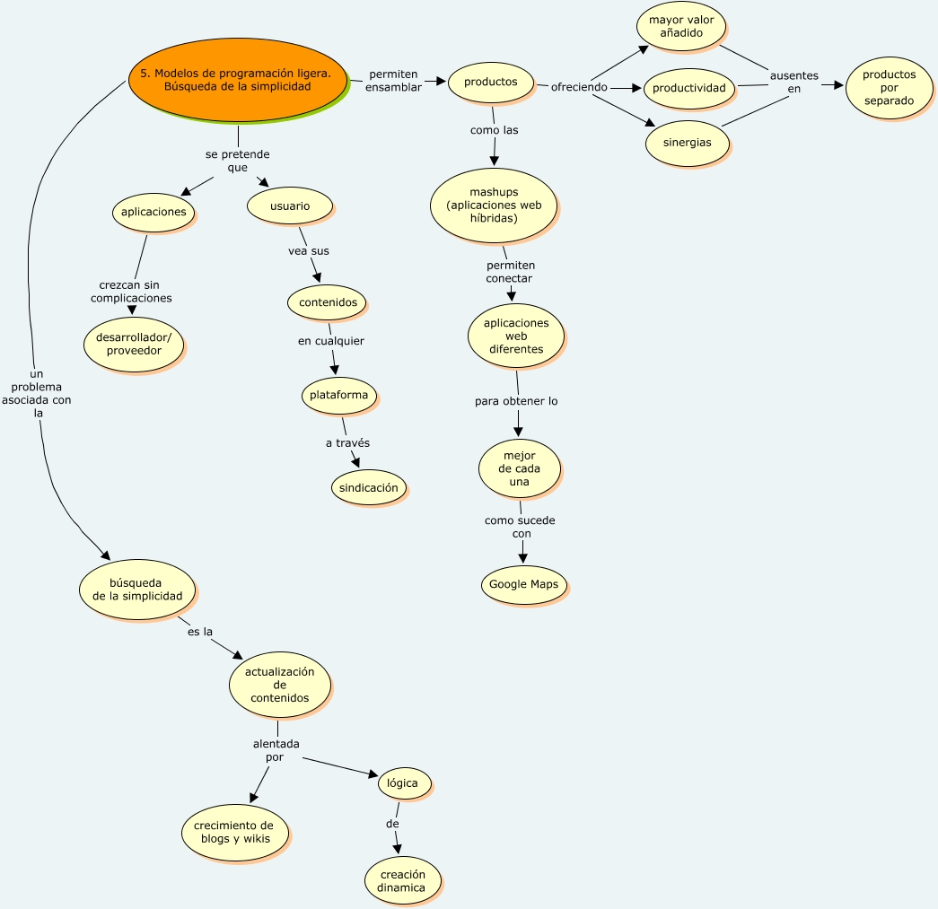 Este Cmap, tiene información relacionada con: Principio 5 - María José, productos ofreciendo sinergias, 5. Modelos de programación ligera. Búsqueda de la simplicidad un problema asociada con la búsqueda de la simplicidad, actualización de contenidos alentada por crecimiento de blogs y wikis, aplicaciones crezcan sin complicaciones desarrollador/ proveedor, 5. Modelos de programación ligera. Búsqueda de la simplicidad permiten ensamblar productos, productividad ausentes en productos por separado, actualización de contenidos alentada por lógica, contenidos en cualquier plataforma, mashups (aplicaciones web híbridas) permiten conectar aplicaciones web diferentes, usuario vea sus contenidos, aplicaciones web diferentes para obtener lo mejor de cada una, mayor valor añadido ausentes en productos por separado, productos ofreciendo productividad, 5. Modelos de programación ligera. Búsqueda de la simplicidad se pretende que usuario, 5. Modelos de programación ligera. Búsqueda de la simplicidad se pretende que aplicaciones, mejor de cada una como sucede con Google Maps, sinergias ausentes en productos por separado, productos ofreciendo mayor valor añadido, búsqueda de la simplicidad es la actualización de contenidos, plataforma a través sindicación