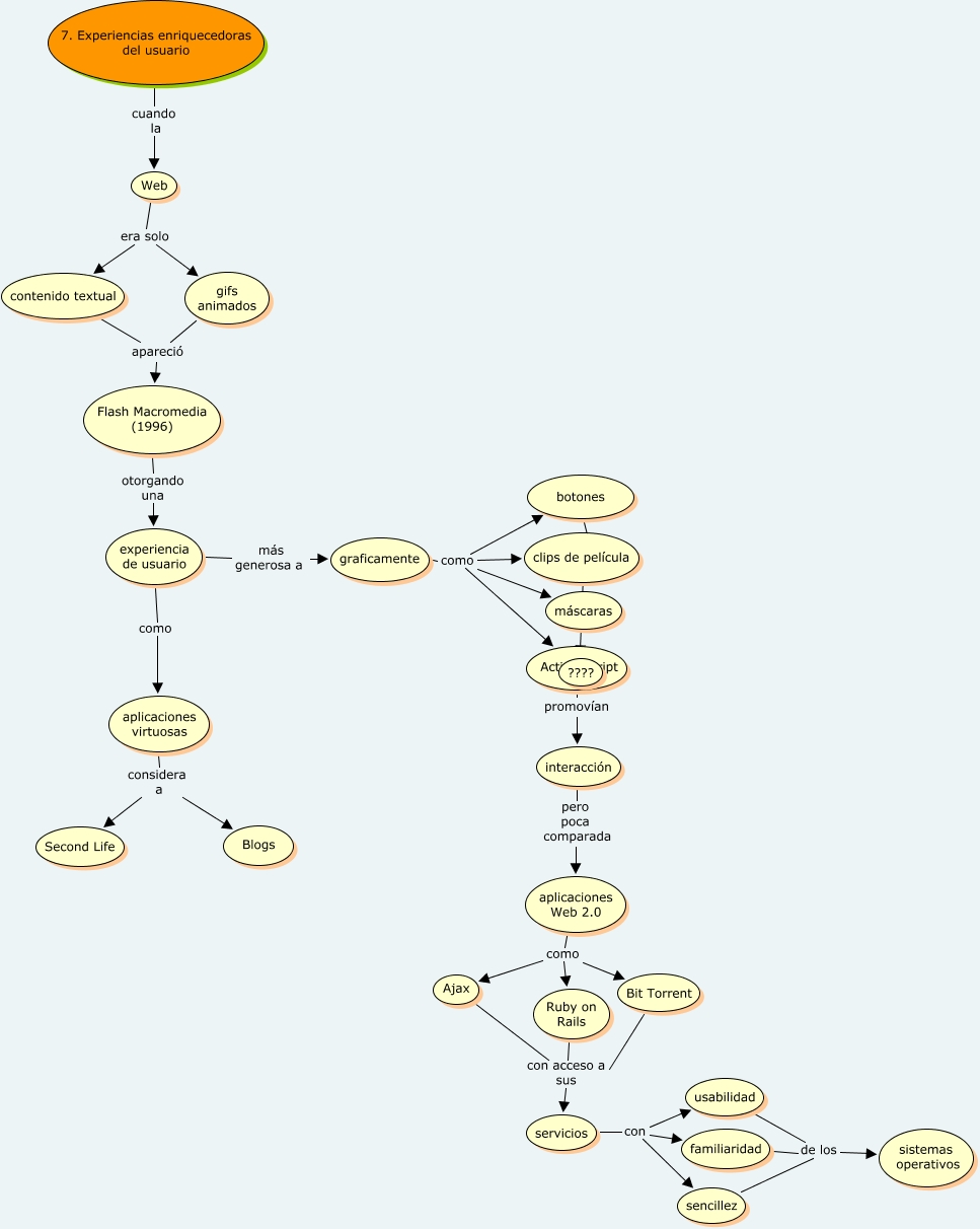 Este Cmap, tiene información relacionada con: Principio 7 - María José, 7. Experiencias enriquecedoras del usuario cuando la Web, Bit Torrent con acceso a sus servicios, Action Script promovían interacción, Web era solo contenido textual, graficamente como botones, aplicaciones virtuosas considera a Second Life, usabilidad de los sistemas operativos, sencillez de los sistemas operativos, servicios con familiaridad, aplicaciones Web 2.0 como Bit Torrent, Web era solo gifs animados, aplicaciones Web 2.0 como Ajax, graficamente como clips de película, gifs animados apareció Flash Macromedia (1996), aplicaciones Web 2.0 como Ruby on Rails, experiencia de usuario más generosa a graficamente, interacción pero poca comparada aplicaciones Web 2.0, clips de película ???? ????, servicios con sencillez, experiencia de usuario como aplicaciones virtuosas
