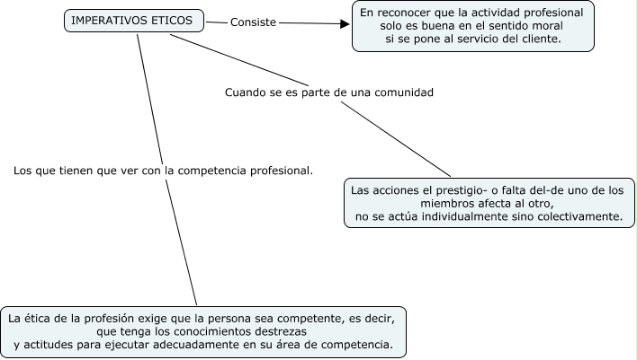 Este Cmap, tiene información relacionada con: deontologia, IMPERATIVOS ETICOS Consiste En reconocer que la actividad profesional solo es buena en el sentido moral si se pone al servicio del cliente., IMPERATIVOS ETICOS Los que tienen que ver con la competencia profesional. La ética de la profesión exige que la persona sea competente, es decir, que tenga los conocimientos destrezas y actitudes para ejecutar adecuadamente en su área de competencia., IMPERATIVOS ETICOS Cuando se es parte de una comunidad Las acciones el prestigio- o falta del-de uno de los miembros afecta al otro, no se actúa individualmente sino colectivamente.