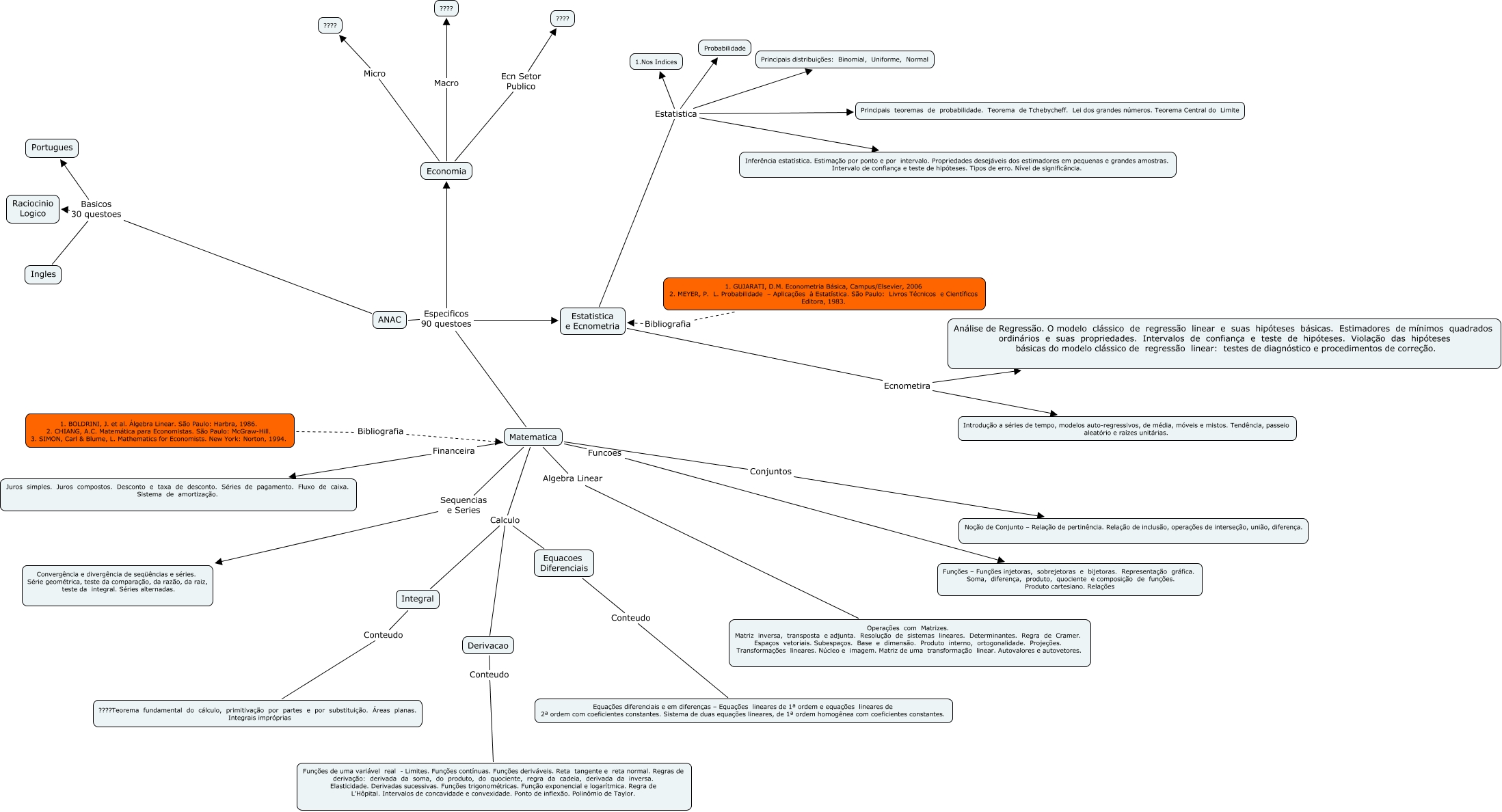 This Concept Map, created with IHMC CmapTools, has information related to: estudo anac, Estatistica e Ecnometria Estatistica Inferência estatística. Estimação por ponto e por intervalo. Propriedades desejáveis dos estimadores em pequenas e grandes amostras. Intervalo de confiança e teste de hipóteses. Tipos de erro. Nível de significância., Economia Ecn Setor Publico ????, Integral Conteudo ????Teorema fundamental do cálculo, primitivação por partes e por substituição. Áreas planas. Integrais impróprias, ANAC Especificos 90 questoes Estatistica e Ecnometria, Estatistica e Ecnometria Estatistica Probabilidade, ANAC Basicos 30 questoes Portugues, Matematica Calculo Derivacao, 1. BOLDRINI, J. et al. Álgebra Linear. São Paulo: Harbra, 1986. 2. CHIANG, A.C. Matemática para Economistas. São Paulo: McGraw-Hill. 3. SIMON, Carl & Blume, L. Mathematics for Economists. New York: Norton, 1994. Bibliografia Matematica, ANAC Especificos 90 questoes Economia, ANAC Basicos 30 questoes Ingles, Matematica Financeira Juros simples. Juros compostos. Desconto e taxa de desconto. Séries de pagamento. Fluxo de caixa. Sistema de amortização., Estatistica e Ecnometria Estatistica 1.Nos Indices, Matematica Calculo Integral, Matematica Algebra Linear Operações com Matrizes. Matriz inversa, transposta e adjunta. Resolução de sistemas lineares. Determinantes. Regra de Cramer. Espaços vetoriais. Subespaços. Base e dimensão. Produto interno, ortogonalidade. Projeções. Transformações lineares. Núcleo e imagem. Matriz de uma transformação linear. Autovalores e autovetores., Economia Micro ????, Estatistica e Ecnometria Estatistica Principais teoremas de probabilidade. Teorema de Tchebycheff. Lei dos grandes números. Teorema Central do Limite, ANAC Especificos 90 questoes Matematica, ANAC Basicos 30 questoes Raciocinio Logico, Matematica Funcoes Funções – Funções injetoras, sobrejetoras e bijetoras. Representação gráfica. Soma, diferença, produto, quociente e composição de funções. Produto cartesiano. Relações, Matematica Conjuntos Noção de Conjunto – Relação de pertinência. Relação de inclusão, operações de interseção, união, diferença.