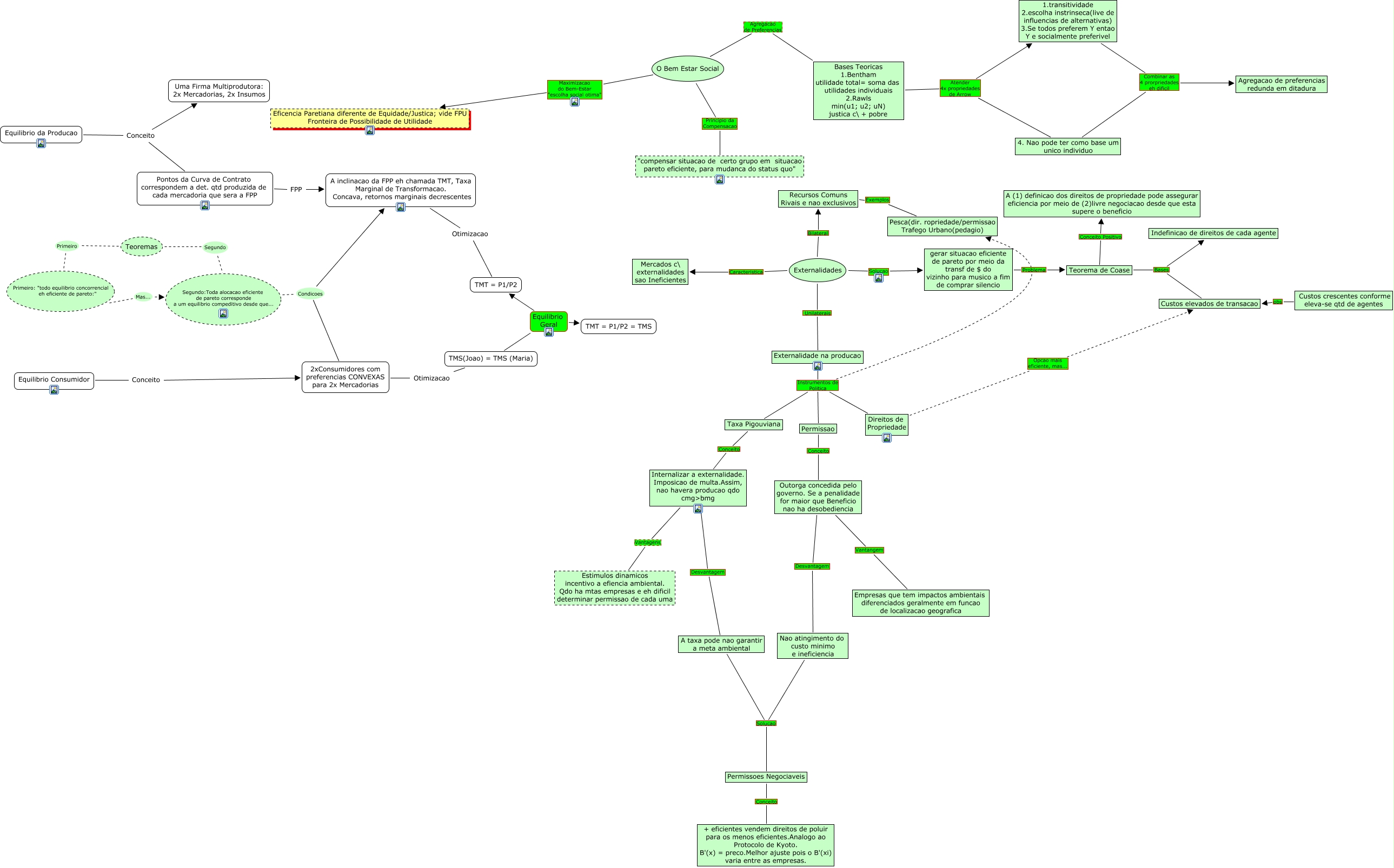 This Concept Map, created with IHMC CmapTools, has information related to: Equilibrio Geral, Bem-Estar, Externalides, Teorema de Coase Conceito Positivo A (1) definicao dos direitos de propriedade pode assegurar eficiencia por meio de (2)livre negociacao desde que esta supere o beneficio, Externalidade na producao Instrumentos de Politica Permissao, Externalidade na producao Instrumentos de Politica Taxa Pigouviana, A taxa pode nao garantir a meta ambiental Solucao Permissoes Negociaveis, gerar situacao eficiente de pareto por meio da transf de $ do vizinho para musico a fim de comprar silencio Problema Teorema de Coase, Nao atingimento do custo minimo e ineficiencia Solucao Permissoes Negociaveis, Equilibrio Consumidor Conceito 2xConsumidores com preferencias CONVEXAS para 2x Mercadorias, Permissoes Negociaveis Conceito + eficientes vendem direitos de poluir para os menos eficientes.Analogo ao Protocolo de Kyoto. B'(x) = preco.Melhor ajuste pois o B'(xi) varia entre as empresas., Outorga concedida pelo governo. Se a penalidade for maior que Beneficio nao ha desobediencia Vantangem Empresas que tem impactos ambientais diferenciados geralmente em funcao de localizacao geografica, Direitos de Propriedade Opcao mais eficiente, mas... Custos elevados de transacao, Taxa Pigouviana Conceito Internalizar a externalidade. Imposicao de multa.Assim, nao havera producao qdo cmg>bmg, TMS(Joao) = TMS (Maria) Equilibrio Geral TMT = P1/P2 = TMS, Equilibrio da Producao Conceito Uma Firma Multiprodutora: 2x Mercadorias, 2x Insumos, O Bem Estar Social Principio da Compensacao "compensar situacao de certo grupo em situacao pareto eficiente, para mudanca do status quo", Externalidade na producao Instrumentos de Politica Direitos de Propriedade, Outorga concedida pelo governo. Se a penalidade for maior que Beneficio nao ha desobediencia Desvantagem Nao atingimento do custo minimo e ineficiencia, Recursos Comuns Rivais e nao exclusivos Exemplos Pesca(dir. ropriedade/permissao Trafego Urbano(pedagio), Teoremas Segundo Segundo:Toda alocacao eficiente de pareto corresponde a um equilibrio compeditivo desde que..., 2xConsumidores com preferencias CONVEXAS para 2x Mercadorias Condicoes A inclinacao da FPP eh chamada TMT, Taxa Marginal de Transformacao. Concava, retornos marginais decrescentes, Teorema de Coase Bases Custos elevados de transacao