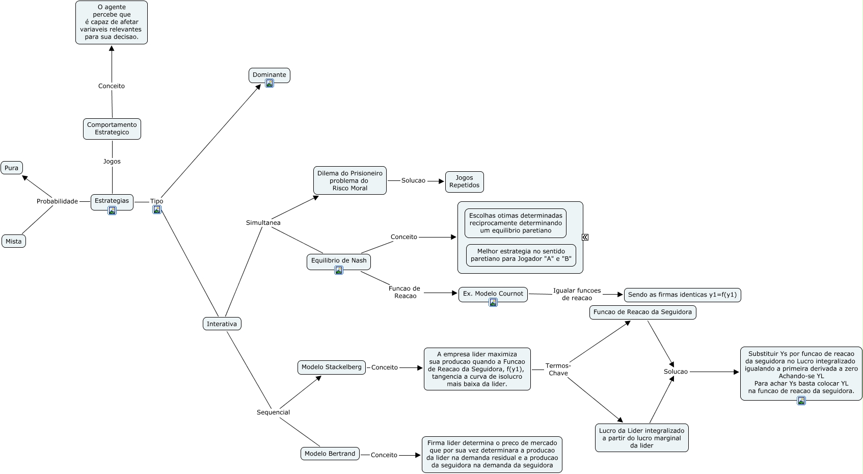 This Concept Map, created with IHMC CmapTools, has information related to: Teoria dos Jogos, Oligopolio, Estrategias Tipo Interativa, Interativa Simultanea Equilibrio de Nash, Estrategias Probabilidade Mista, Equilibrio de Nash Conceito ????, Funcao de Reacao da Seguidora Solucao Substituir Ys por funcao de reacao da seguidora no Lucro integralizado igualando a primeira derivada a zero Achando-se YL Para achar Ys basta colocar YL na funcao de reacao da seguidora., A empresa lider maximiza sua producao quando a Funcao de Reacao da Seguidora, f(y1), tangencia a curva de isolucro mais baixa da lider. Termos- Chave Funcao de Reacao da Seguidora, Estrategias Tipo Dominante, Comportamento Estrategico Jogos Estrategias, Estrategias Probabilidade Pura, Lucro da Lider integralizado a partir do lucro marginal da lider Solucao Substituir Ys por funcao de reacao da seguidora no Lucro integralizado igualando a primeira derivada a zero Achando-se YL Para achar Ys basta colocar YL na funcao de reacao da seguidora., Dilema do Prisioneiro problema do Risco Moral Solucao Jogos Repetidos, Comportamento Estrategico Conceito O agente percebe que é capaz de afetar variaveis relevantes para sua decisao., Interativa Sequencial Modelo Bertrand, Modelo Stackelberg Conceito A empresa lider maximiza sua producao quando a Funcao de Reacao da Seguidora, f(y1), tangencia a curva de isolucro mais baixa da lider., A empresa lider maximiza sua producao quando a Funcao de Reacao da Seguidora, f(y1), tangencia a curva de isolucro mais baixa da lider. Termos- Chave Lucro da Lider integralizado a partir do lucro marginal da lider, Modelo Bertrand Conceito Firma lider determina o preco de mercado que por sua vez determinara a producao da lider na demanda residual e a producao da seguidora na demanda da seguidora, Ex. Modelo Cournot Igualar funcoes de reacao Sendo as firmas identicas y1=f(y1), Interativa Simultanea Dilema do Prisioneiro problema do Risco Moral, Interativa Sequencial Modelo Stackelberg, Equilibrio de Nash Funcao de Reacao Ex. Modelo Cournot