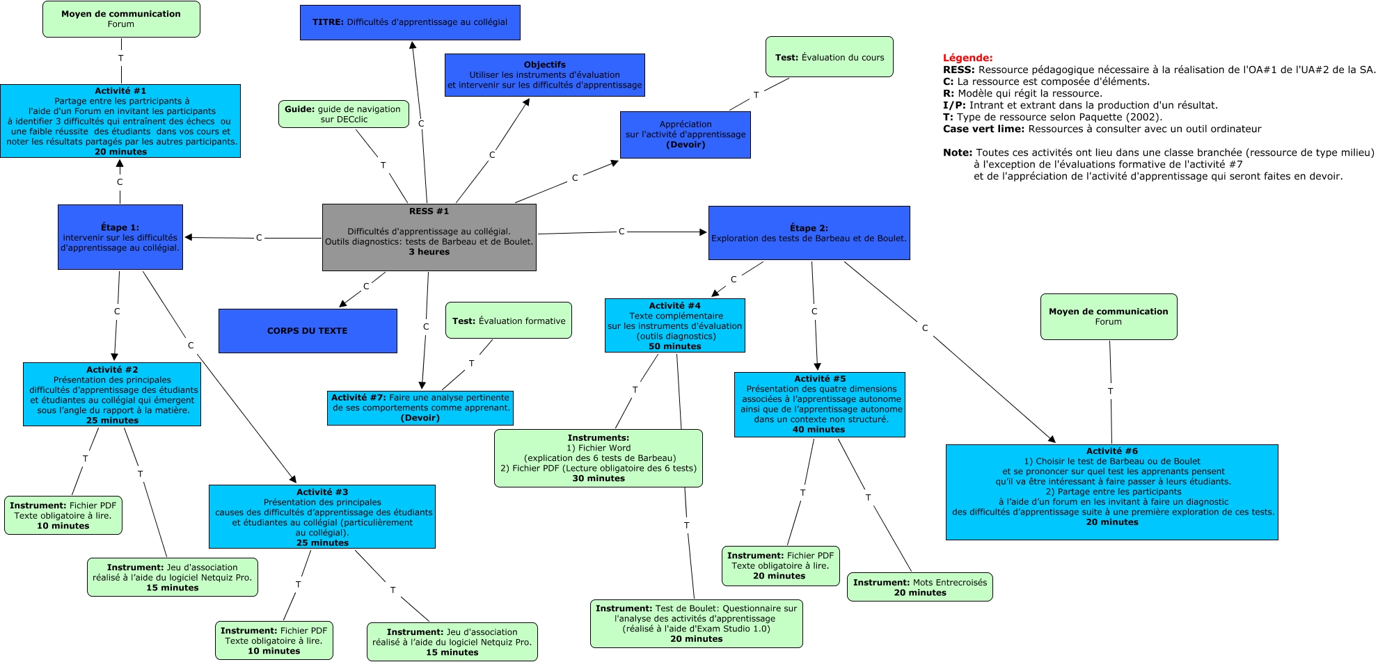 Cette carte de concepts créée avec IHMC CmapTools traite de: PED 860-RESS1réelle-TP3, Activité #4 Texte complémentaire sur les instruments d'évaluation (outils diagnostics) 50 minutes T Instrument: Test de Boulet: Questionnaire sur l'analyse des activités d'apprentissage (réalisé à l'aide d'Exam Studio 1.0) 20 minutes, Activité #2 Présentation des principales difficultés d’apprentissage des étudiants et étudiantes au collégial qui émergent sous l’angle du rapport à la matière. 25 minutes T Instrument: Jeu d'association réalisé à l’aide du logiciel Netquiz Pro. 15 minutes, Étape 1: intervenir sur les difficultés d'apprentissage au collégial. C Activité #1 Partage entre les partricipants à l'aide d'un Forum en invitant les participants à identifier 3 difficultés qui entraînent des échecs ou une faible réussite des étudiants dans vos cours et noter les résultats partagés par les autres participants. 20 minutes, RESS #1 Difficultés d'apprentissage au collégial. Outils diagnostics: tests de Barbeau et de Boulet. 3 heures C Étape 1: intervenir sur les difficultés d'apprentissage au collégial., Activité #5 Présentation des quatre dimensions associées à l’apprentissage autonome ainsi que de l’apprentissage autonome dans un contexte non structuré. 40 minutes T Instrument: Fichier PDF Texte obligatoire à lire. 20 minutes, Activité #7: Faire une analyse pertinente de ses comportements comme apprenant. (Devoir) T Test: Évaluation formative, Activité #4 Texte complémentaire sur les instruments d'évaluation (outils diagnostics) 50 minutes T Instruments: 1) Fichier Word (explication des 6 tests de Barbeau) 2) Fichier PDF (Lecture obligatoire des 6 tests) 30 minutes, Activité #1 Partage entre les partricipants à l'aide d'un Forum en invitant les participants à identifier 3 difficultés qui entraînent des échecs ou une faible réussite des étudiants dans vos cours et noter les résultats partagés par les autres participants. 20 minutes T Moyen de communication Forum, Étape 2: Exploration des tests de Barbeau et de Boulet. C Activité #6 1) Choisir le test de Barbeau ou de Boulet et se prononcer sur quel test les apprenants pensent qu’il va être intéressant à faire passer à leurs étudiants. 2) Partage entre les participants à l’aide d’un forum en les invitant à faire un diagnostic des difficultés d’apprentissage suite à une première exploration de ces tests. 20 minutes, RESS #1 Difficultés d'apprentissage au collégial. Outils diagnostics: tests de Barbeau et de Boulet. 3 heures C TITRE: Difficultés d'apprentissage au collégial, Étape 1: intervenir sur les difficultés d'apprentissage au collégial. C Activité #3 Présentation des principales causes des difficultés d’apprentissage des étudiants et étudiantes au collégial (particulièrement au collégial). 25 minutes, Activité #3 Présentation des principales causes des difficultés d’apprentissage des étudiants et étudiantes au collégial (particulièrement au collégial). 25 minutes T Instrument: Fichier PDF Texte obligatoire à lire. 10 minutes, RESS #1 Difficultés d'apprentissage au collégial. Outils diagnostics: tests de Barbeau et de Boulet. 3 heures C Objectifs Utiliser les instruments d'évaluation et intervenir sur les difficultés d'apprentissage, RESS #1 Difficultés d'apprentissage au collégial. Outils diagnostics: tests de Barbeau et de Boulet. 3 heures C CORPS DU TEXTE, Étape 2: Exploration des tests de Barbeau et de Boulet. C Activité #5 Présentation des quatre dimensions associées à l’apprentissage autonome ainsi que de l’apprentissage autonome dans un contexte non structuré. 40 minutes, Étape 2: Exploration des tests de Barbeau et de Boulet. C Activité #4 Texte complémentaire sur les instruments d'évaluation (outils diagnostics) 50 minutes, Activité #5 Présentation des quatre dimensions associées à l’apprentissage autonome ainsi que de l’apprentissage autonome dans un contexte non structuré. 40 minutes T Instrument: Mots Entrecroisés 20 minutes, Étape 1: intervenir sur les difficultés d'apprentissage au collégial. C Activité #1 Partage entre les partricipants à l'aide d'un Forum en invitant les participants à identifier 3 difficultés qui entraînent des échecs ou une faible réussite des étudiants dans vos cours et noter les résultats partagés par les autres participants. 20 minutes, Étape 1: intervenir sur les difficultés d'apprentissage au collégial. C Activité #2 Présentation des principales difficultés d’apprentissage des étudiants et étudiantes au collégial qui émergent sous l’angle du rapport à la matière. 25 minutes, Appréciation sur l'activité d'apprentissage (Devoir) T Test: Évaluation du cours
